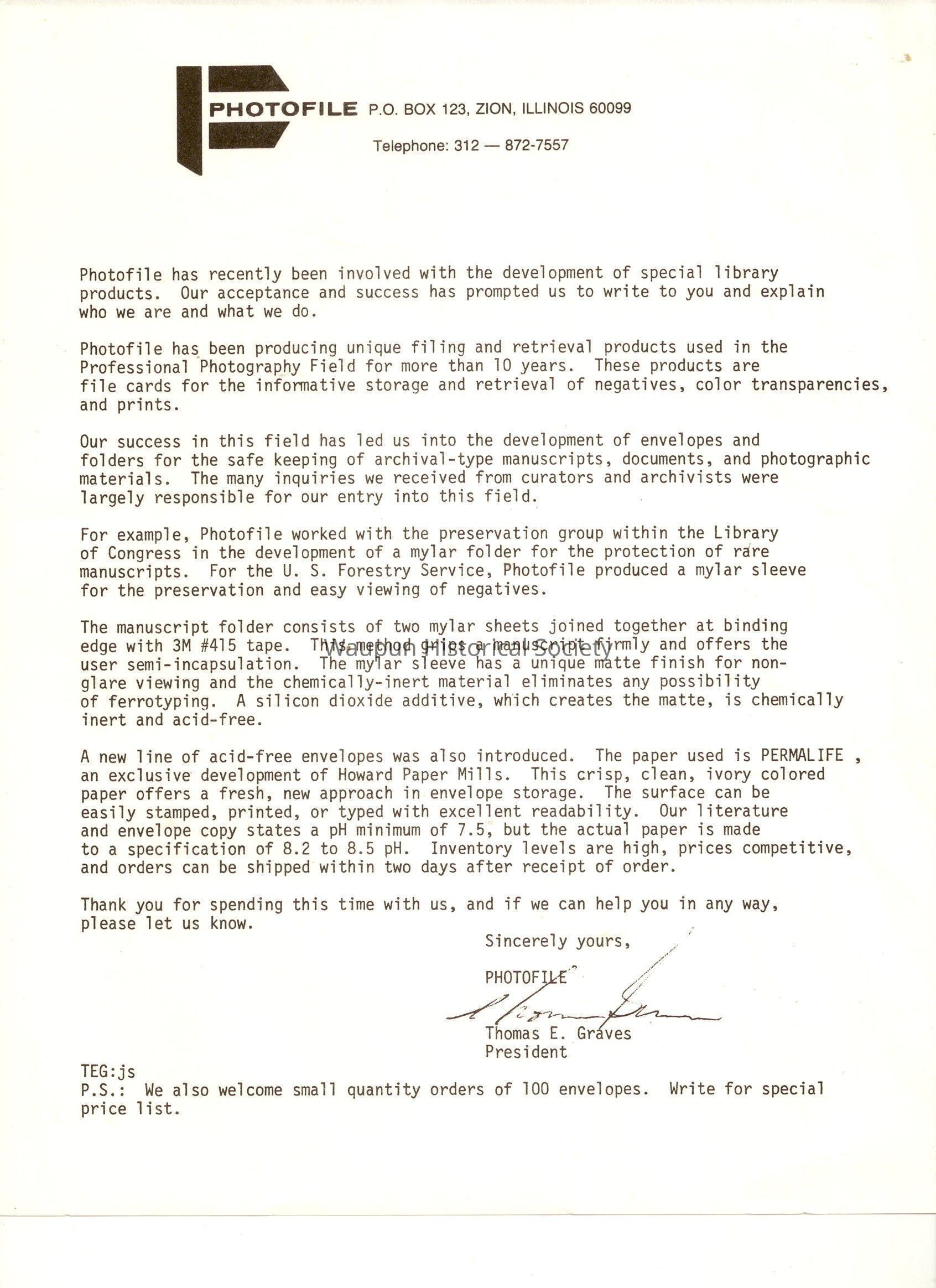 For example, Photofile worked with the preservation group within the Library of Congress in the development of a mylar folder for the protection of rare manuscripts. For the U. S. Forestry Service, Photofile produced a mylar sleeve for the preservation and easy viewing of negatives.