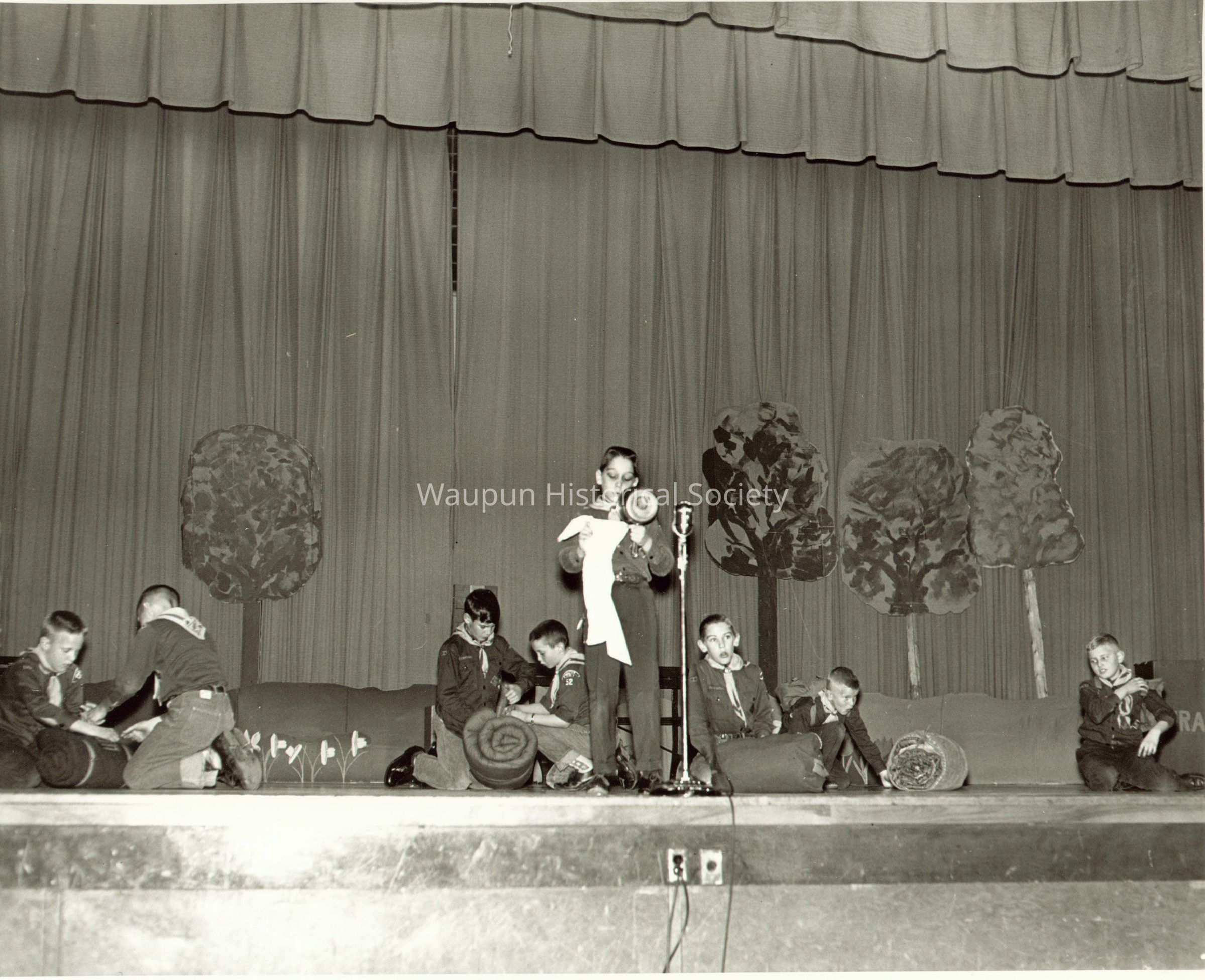 This act was entitled: "Cub Scouts After First Overnight." Although unidentified in the picture, members of this group are: John Savides, Donald Curran Jr., David Curran, Russell Redman, Steven Wagner, Robert Derwae, and Billy Gerrits. The Accompanist was Miss Ann Seibel and Mrs. Andy Schouten, was their Den Mother.Acquisition