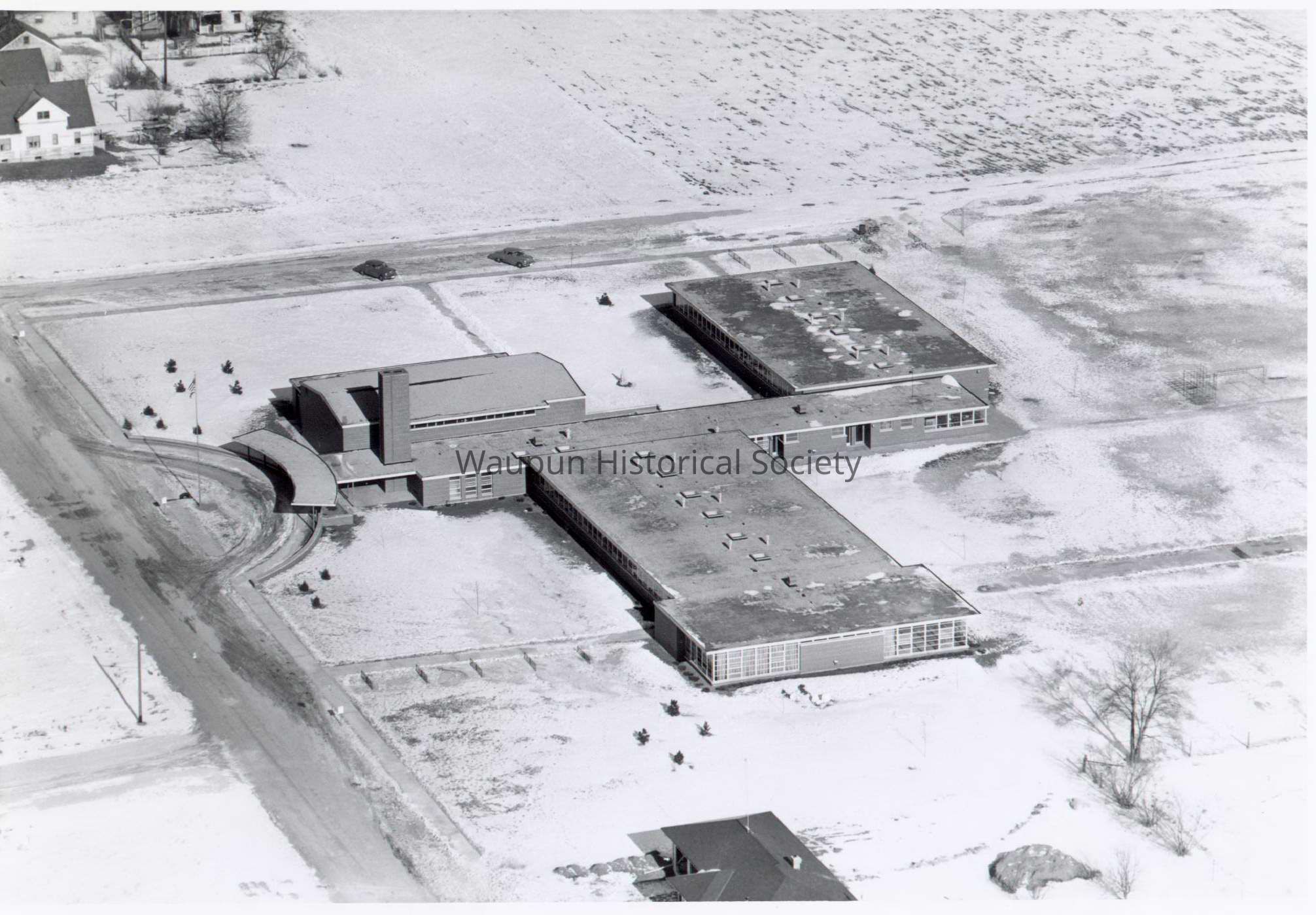 Aerial photo of Washington School. One of the 23 aerial photos donated by John Kirpatrick. On the photo was written, "Waupun Photos, Early 1950's" This photo is 7 inches by 5 inches high. There is also a large version of this photo stored in the large photo collection.Acquisition