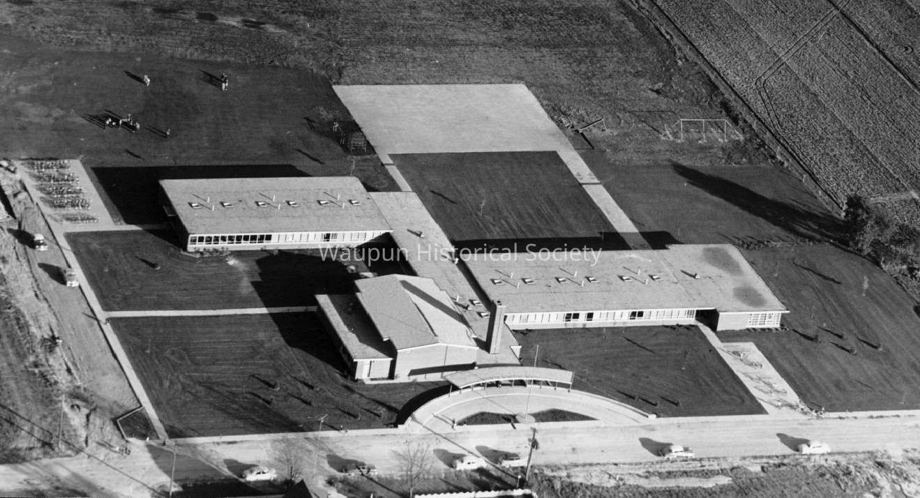 Aerial photo of Washington School. One of the 23 aerial photos donated by John Kirpatrick. On the photo was written, "Waupun Photos, Early 1950's" This photo is 9 inches by 5 inches high.Acquisition