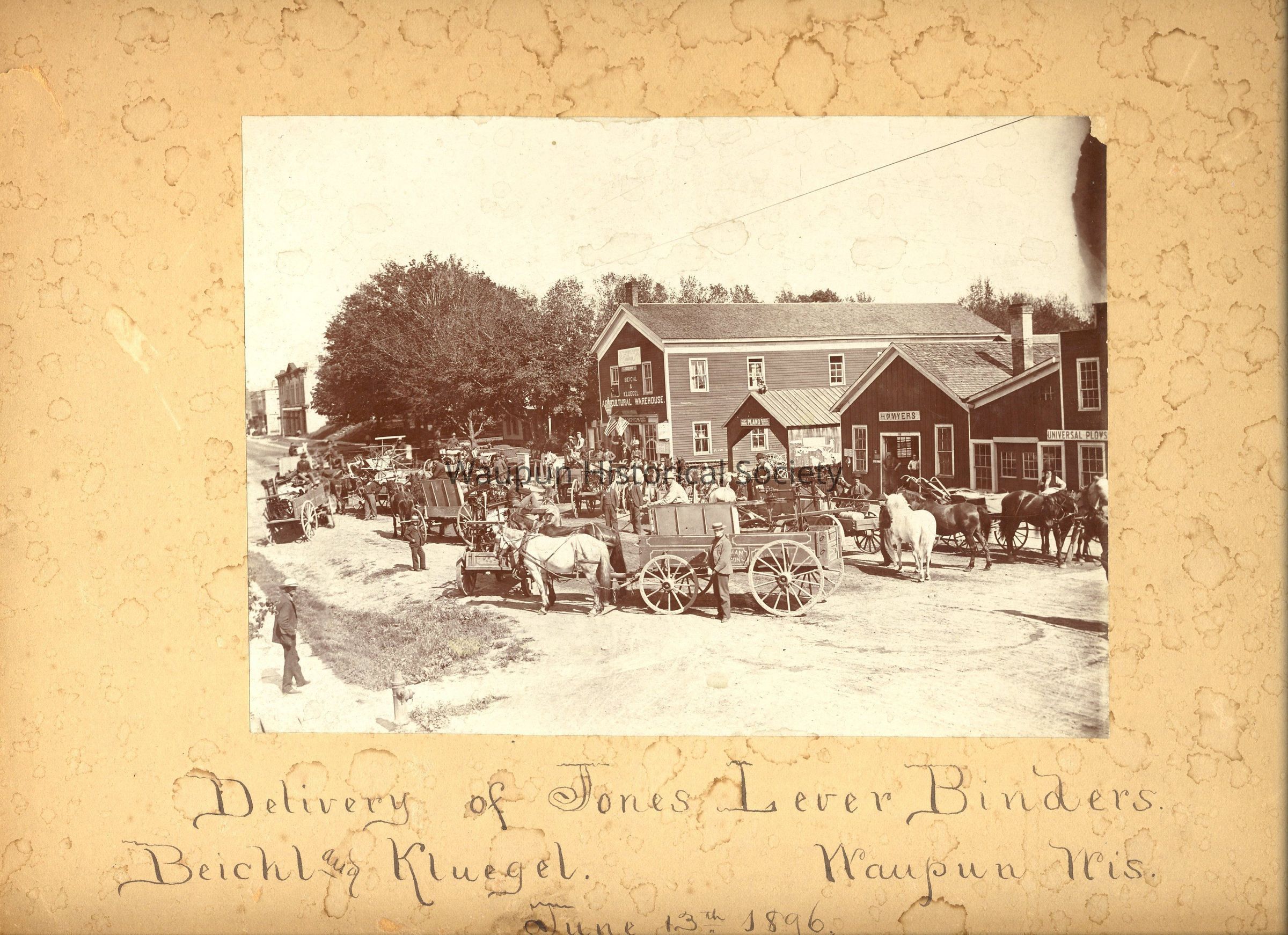 Modes of Transportation. Written on the front of the matting it reads: Delivery of Jones Lever Binders, Beichl & Kluegel. Waupun, Wis. June 13th, 1896
