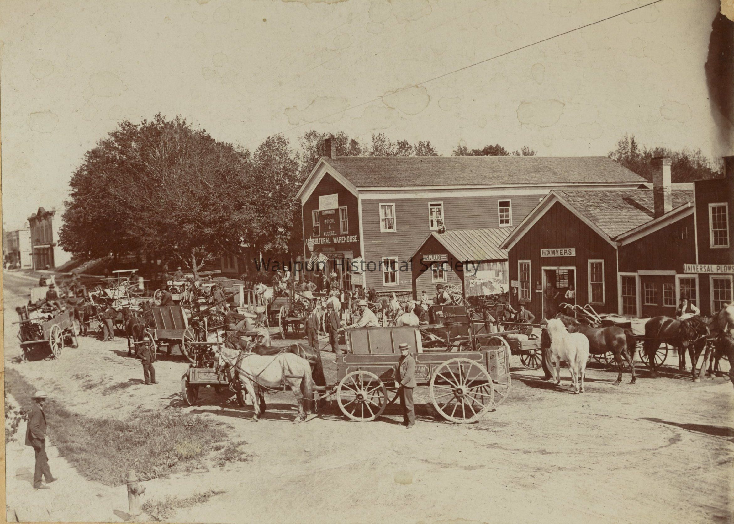 Each building in the photo has signs identifying the business: Beichl & Kluegel Agricultural Warehouse (Center), Plano Delivery (right of center), H.W. Myers (2nd from right), Universal Plows (far right)Acquisition