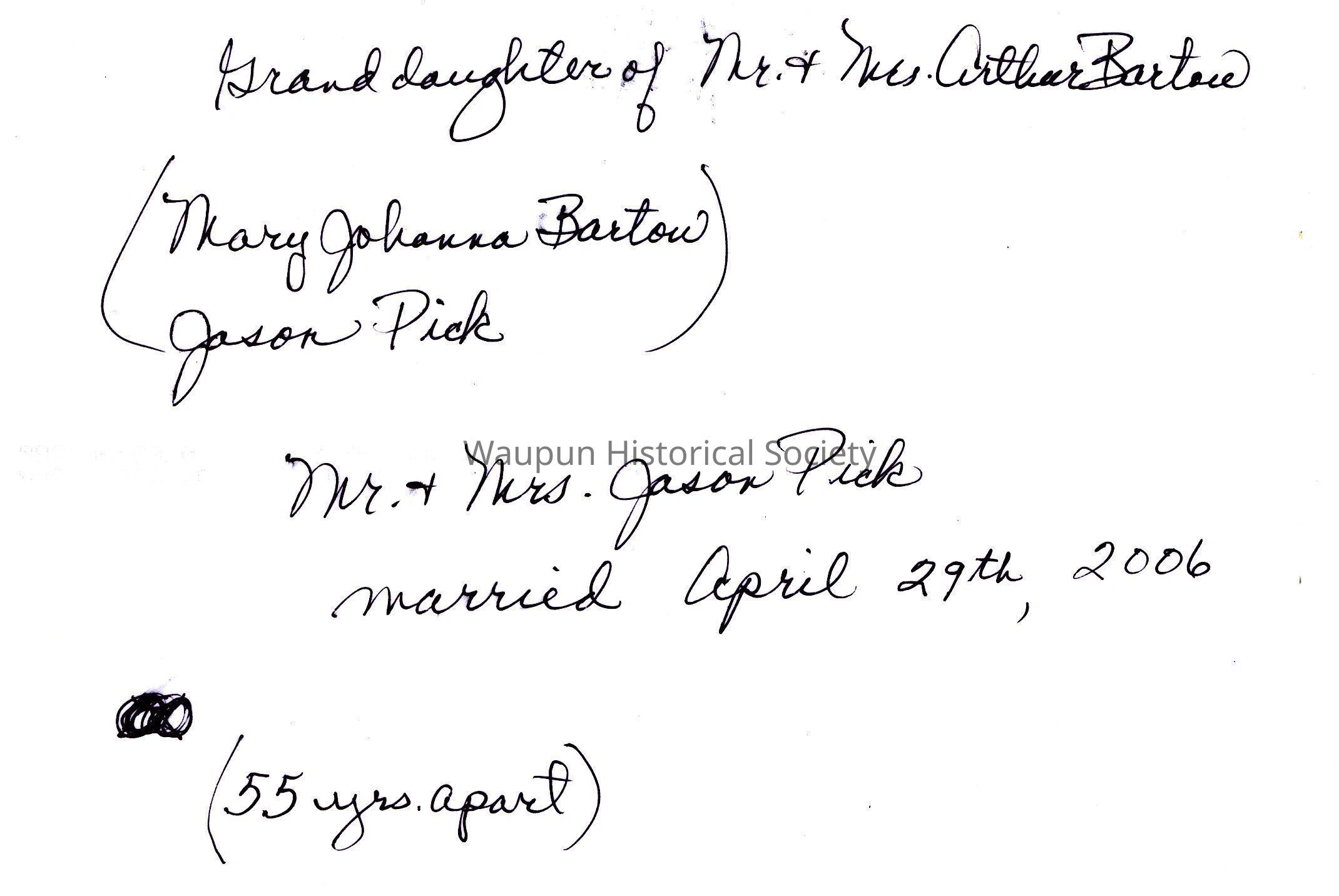 Pictures of brides at The End of the Trail. It is grandparents and grand-daughter. The Grandparents wedding was May 5, 1951, Shirley Karmann, daughter of John and Clara, became Mr. & Mrs. Arthur P. Bartow. The grand daughter got married on April 29, 2006. Mary Johanna Bartow became Mr. & Mrs. Jason Pick, the weddings were 55 years apart.Acquisition