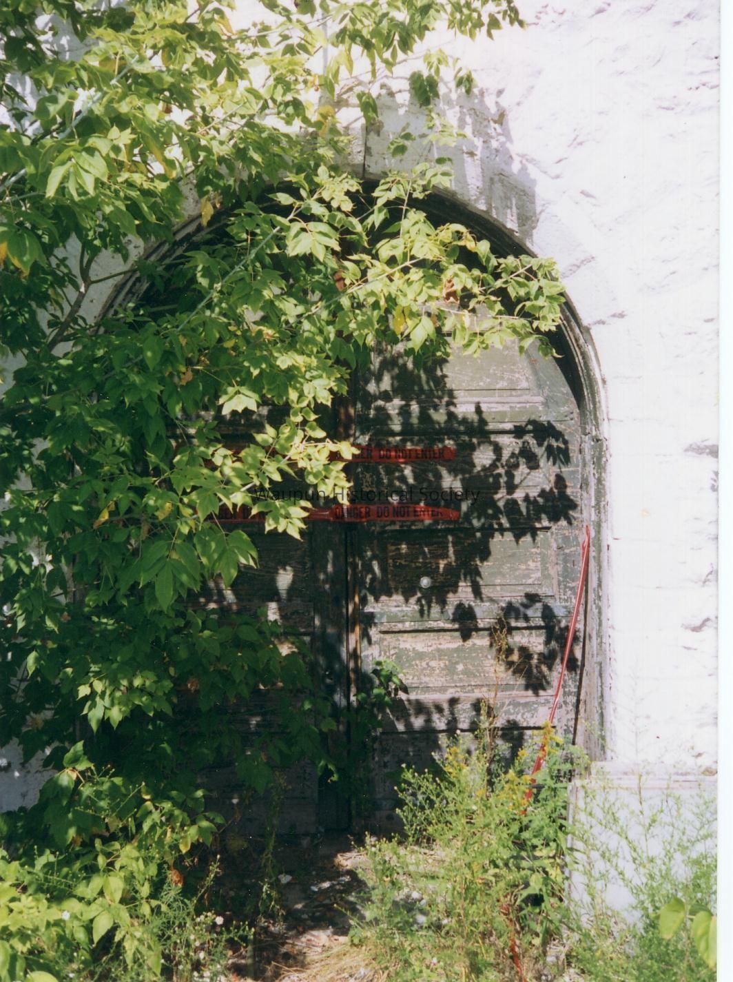 Mill Power Plant. This photo is part of a set of 6 photos taken by Jim Laird & donated to the museum. The show the doorway and stone work of the old mill power plant. These items were taken from the Union Church, (formerly located at 201 East Main St )after the fire of 1916.Acquisition