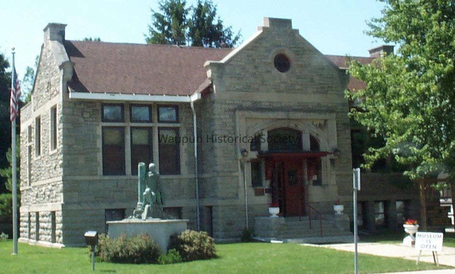 Photo of the "Waupun Public Library." This is a Carnegie building. Andrew Carnegie (1835 - 1919) gave the money to build the building. The cornerstone is dated 1904. Picture was taken for the Waupun Historical Society Stationery, probably in 2000 or 2001,Acquisition