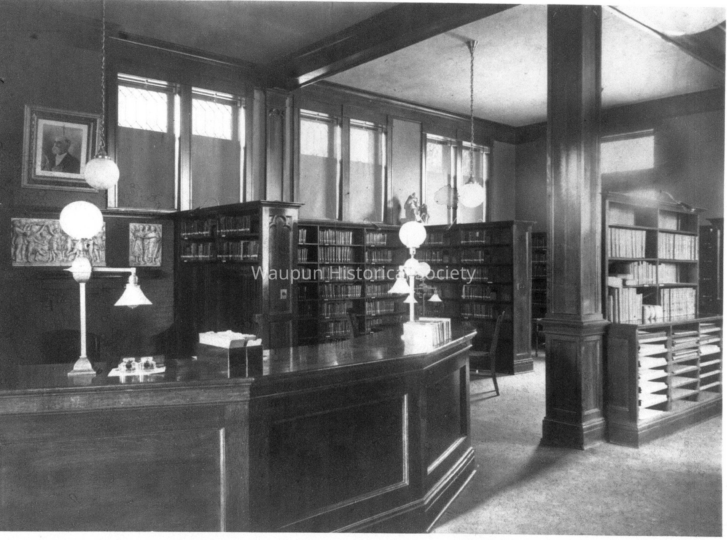 Photograph, Library, Museum. Interior photo of the "Waupun Public Library." This is a Carnegie building. Andrew Carnegie (1835 - 1919) gave the money to build the building. The cornerstone is dated 1904. The building finshed.Acquisition