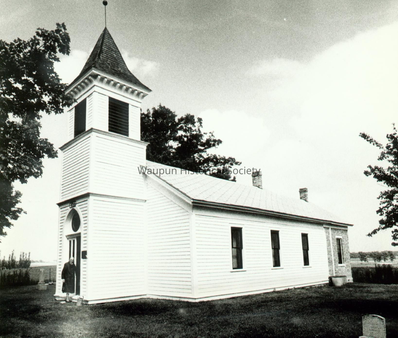 TPhotograph, Church, Norwegian Lutheran. he exterior of the Norwegian Lutheran Church on Church Road, northeast of Waupun. The following is typed on the back of the picture: "Sometimes when one takes the wrong road one finds interesting and unexpected subjects, like we did recently enroute on assignment from Oakfield to Waupun. Taking the wrong turn on a sparsely-traveled road at the north edge of Horicon Marsh, and less than 20 miles from Mayville, we came upon this beautiful little white church nestled among beautiful trees inside a cemetery lot. According to Mr. and Mrs. Theodore Helgeson, caretakers of the Norwegian Lutheran Church build in 1855, the church is now used but once a year. We couldn't resist making some photographs of this neat little structure which was used much by the early settlers of the area. Circuit-rider pastors conducted services in the church weekly until 1920. Now Mr. and Mrs. Helgeson take good care of the grounds and the church and keep the building in repair. Mrs. Helegson is seen at the door."