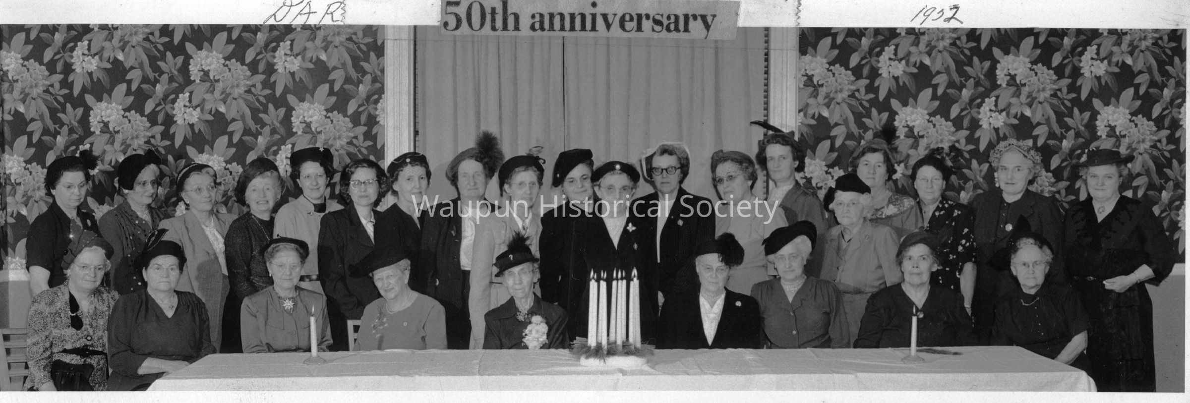 Photo of the women of the DAR taken on the occasion of their 50th anniversary. The picture was taken at the Hotel Waupun in 1952.