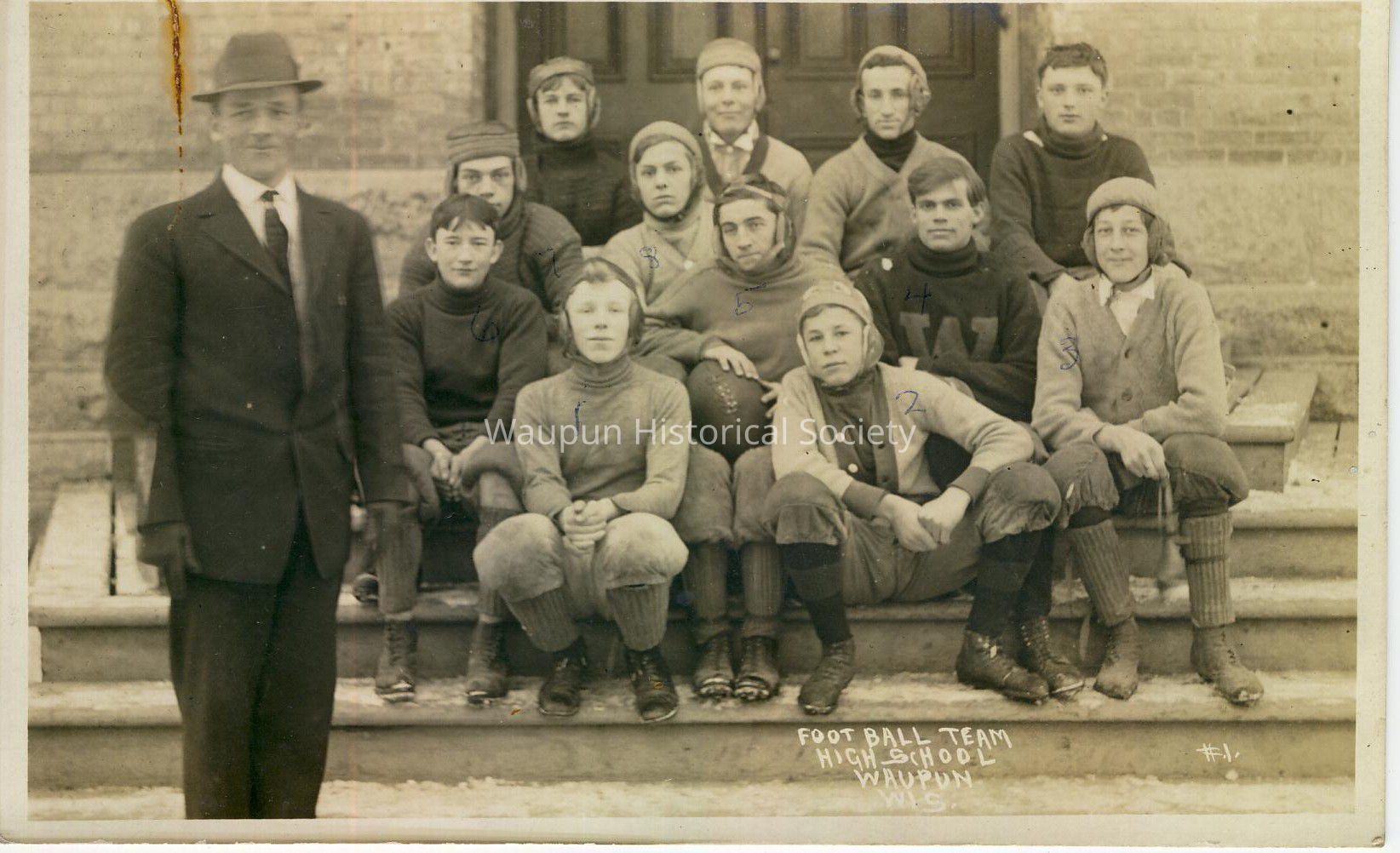 Football Team High School Waupun, Wis. This is a postcard made from a photograph. From the early 1900s. On the back is listed: 1) Trayton H. Davis, 2) Benny Weinberger, 3) Art Hanisch, 4) Harold Allen, 5) - , 6) Carroll --, 7) Reagen, 8) Te Linde, 9) - , 10) - , 11) Berg, 12) Vern - . Coach is unidentified. I have not been able to verify the exact year of this postcard using reference material such as city directories or high school annuals but Trayton Davis graduated from Waupun High School in 1914.