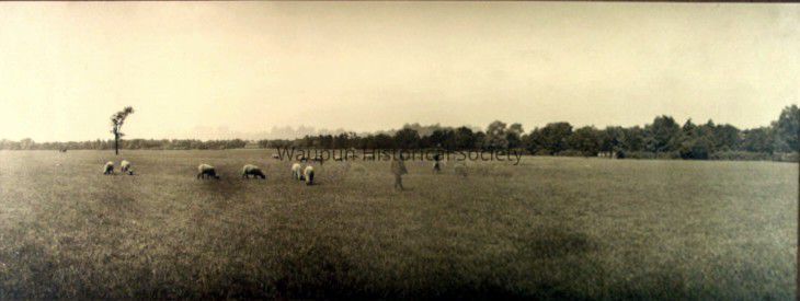 This photo shows sheep and a shepard in a pasture somewhere around Waupun.Acquisition