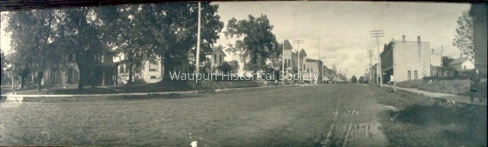 East Main (Washington) St. looking East. On the right is the corner of the Union Church. This church burned and the Waupun City Hall was built on this site. The building next to the left is the Odd Fellows Hall. On the left side of the picture are three homes. The one on the corner became Dr. Wagner and Dr. Schrank offices. These three homes have been torn down, as well as the Waupun Hotel, and are now the Waupun National Bank and parking lots.Acquisition