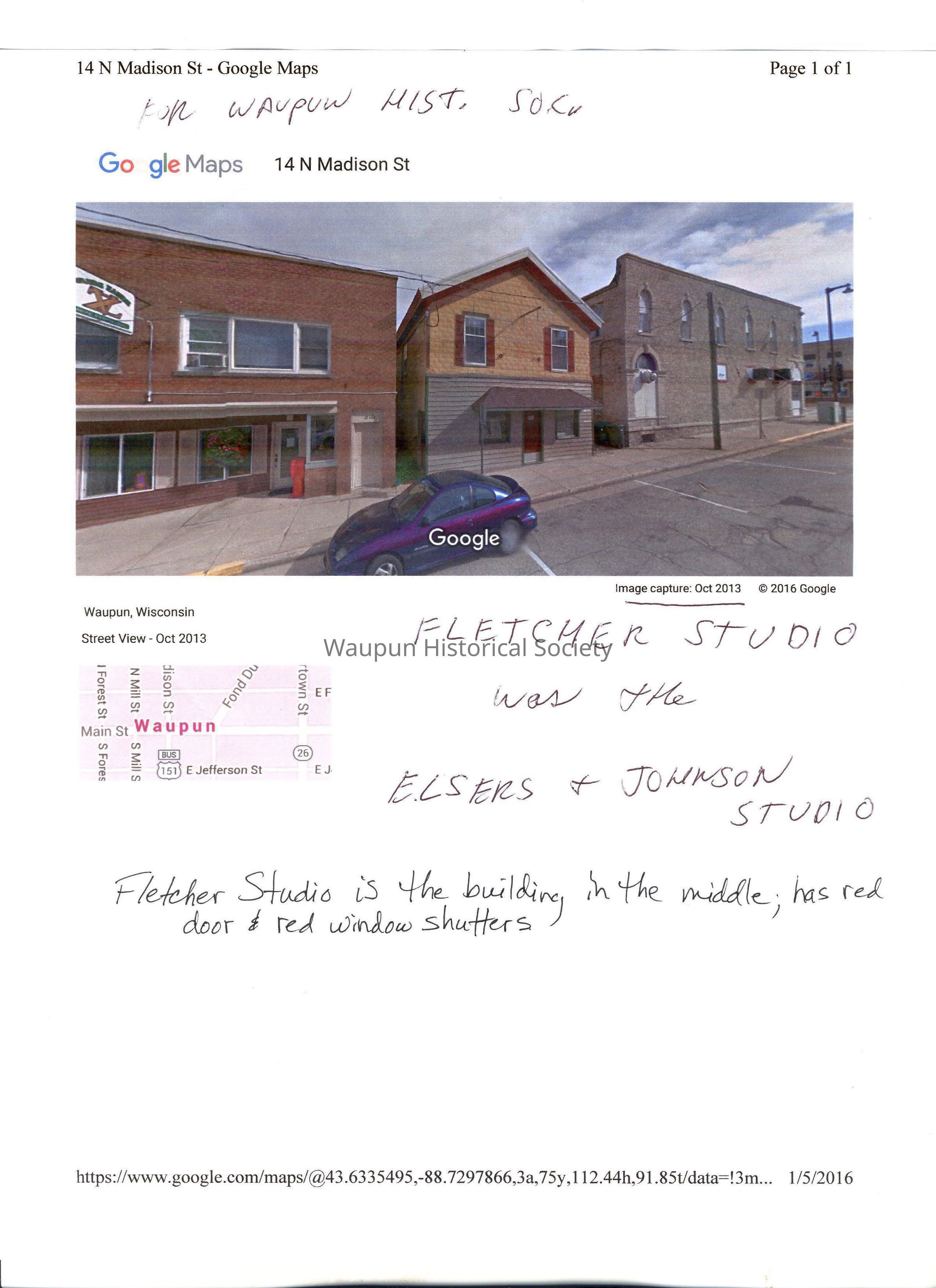 Photograph, Madison Street, Fletcher Studio. Computer copy of photo of Fletcher Studio, 14 N. Madison St., Waupun, WI, October 2013. This was the Elsers & Johnson Studio in earlier years.