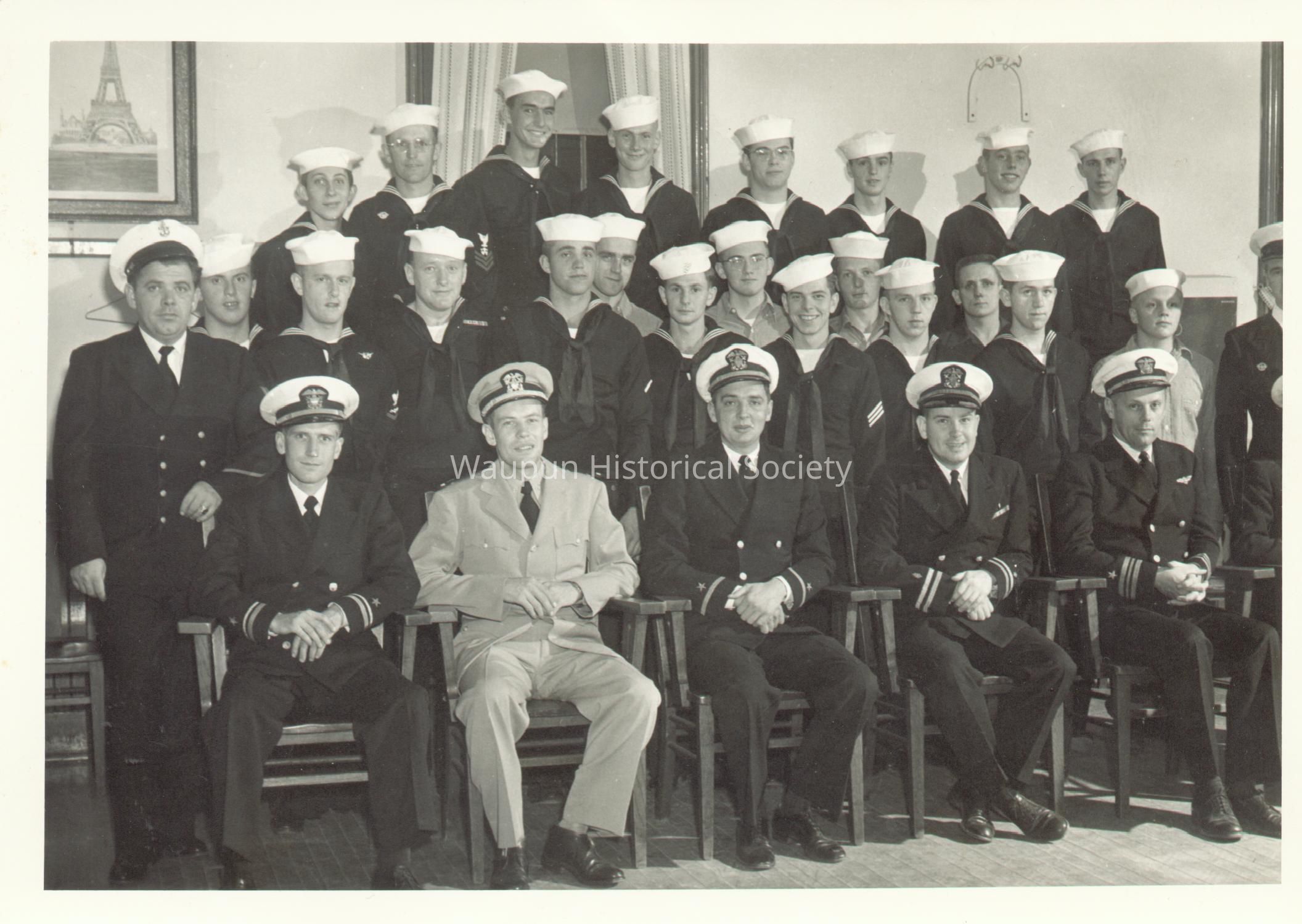 These are Waupun, Beaver Dam and Fond du Lac military personnel from World War II and the Korean War. The group was organized by Dr. Jim Semmens in 1950. They held meetings but were not paid other than collecting points for retirement. The picture was taken in 1951 at the American Legion Building. Not all the people are identified. Front Row, L to R: Stelsel, David (WWII); unkown; Conners, Bill (Beaver Dam); Semmens, Dr. Jim (WWII); Grenzow, Cle (WWII): Middle Row: Jones, Maurice (Chief); Teletzke, Cliff; Willihnganz, Cletus; Gorsuch, Robert (WWII); Gossfeld, Roger; Kirchoff, Elmer (Beaver Dam); Bobholz, Jim; unkown; unkown; Ver Hage, Harlan; unkown; Hackbarth, Jim; unkown; maybe Patrick, Don or Kuzulka, Nick; Sterrenberg, Dr. Charles (Dentist, Beaver Dam); Back row: Wahlen, Ted (Beaver Dam); unkown; Erban, Ed (Fond du Lac); Nimmer, Eugene; unkown; Oestrich, Lester (Beaver Dam); Paskey, Carl; Guth, John