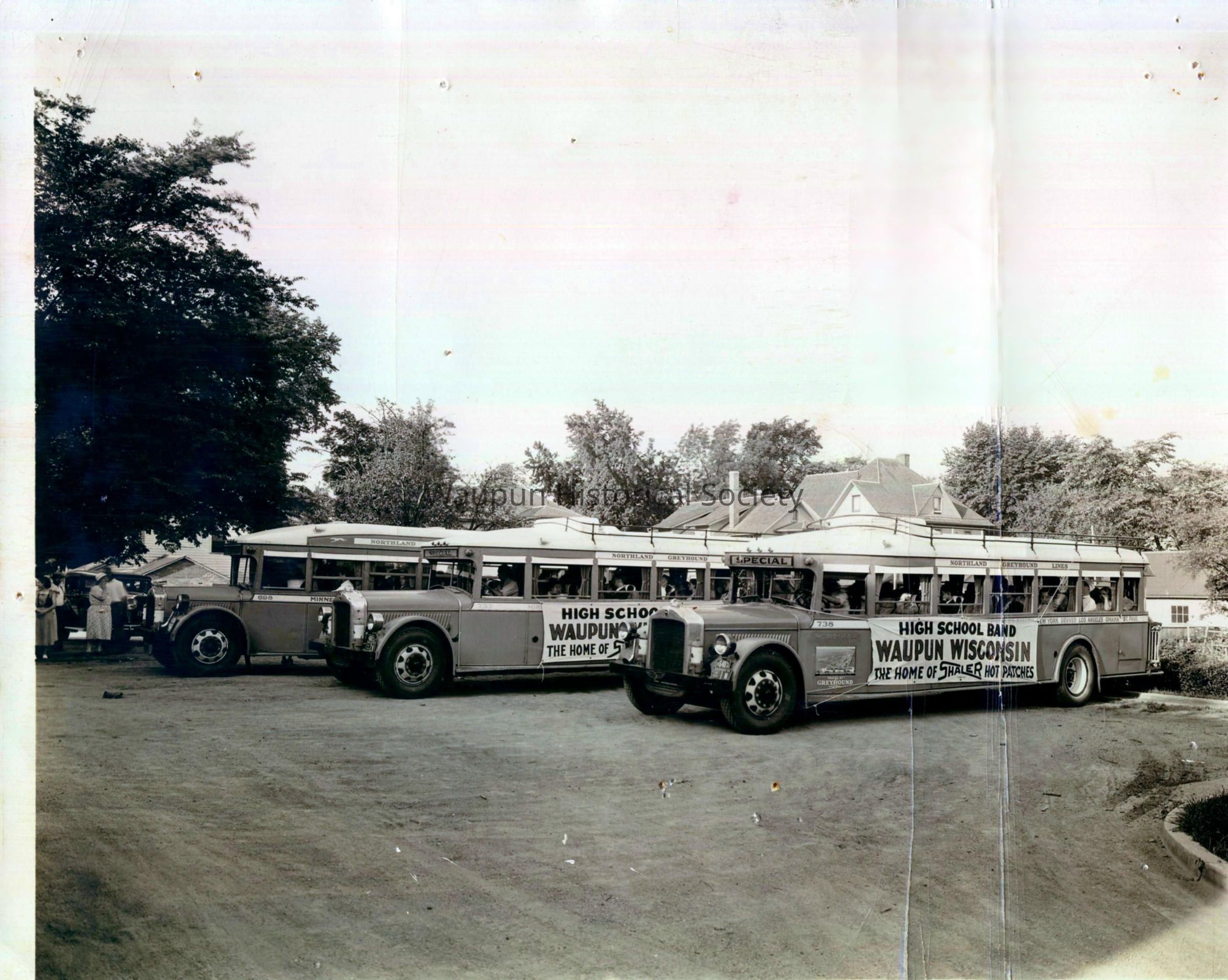 National Band Tournament. This photo shows the Waupun High School band getting to leave for the National Band Tournament in Chicago, Il. The Shaler Co. provided the busses.Acquisition