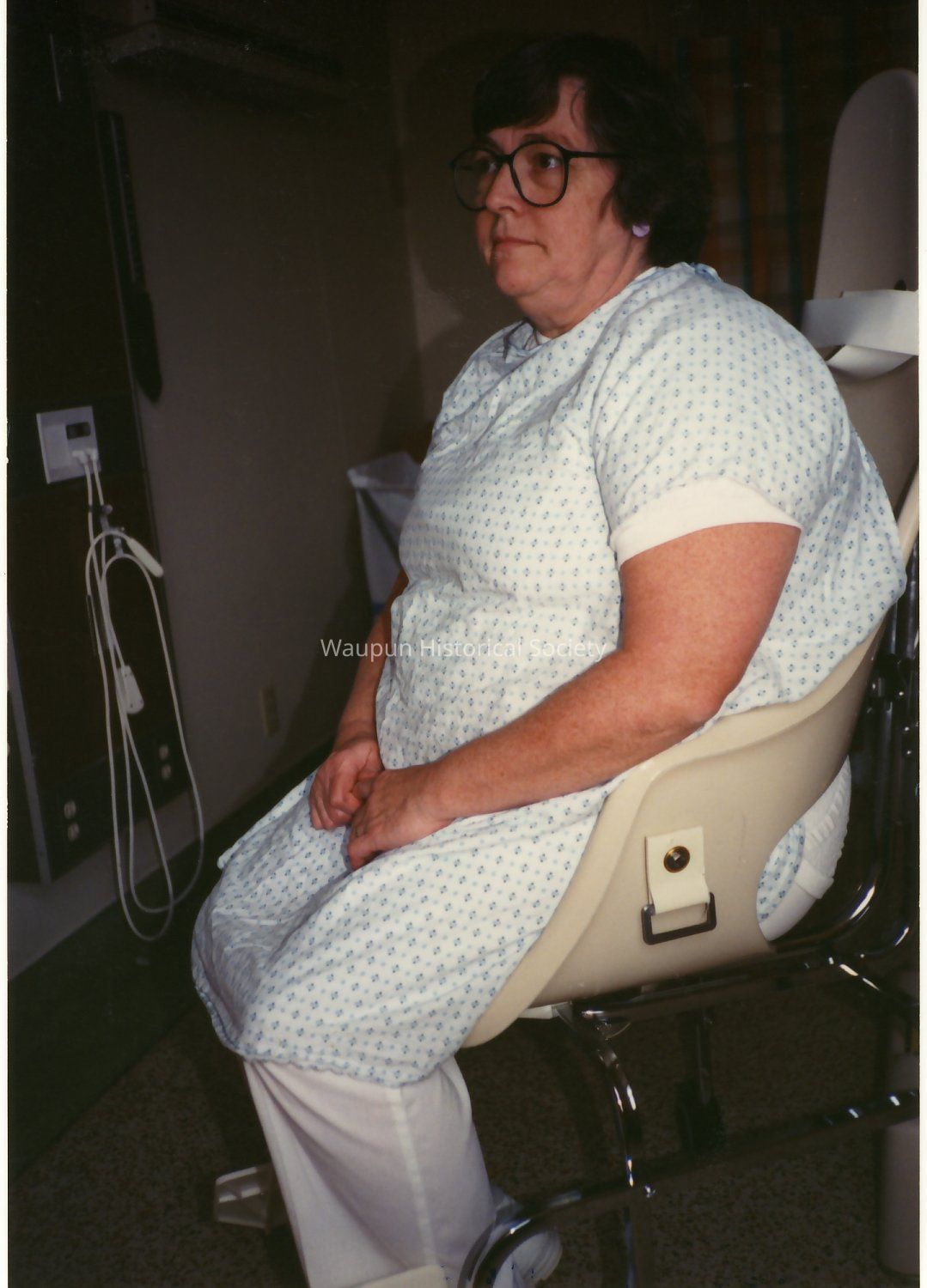 New Mechanical Lift for the Hospital. This photo is a part one of set of three photo taken at the Waupun Memorial Hospital. This photo, and the following two photos shows Audrey Zamzow demonstrating the hospital's new equipment.Acquisition