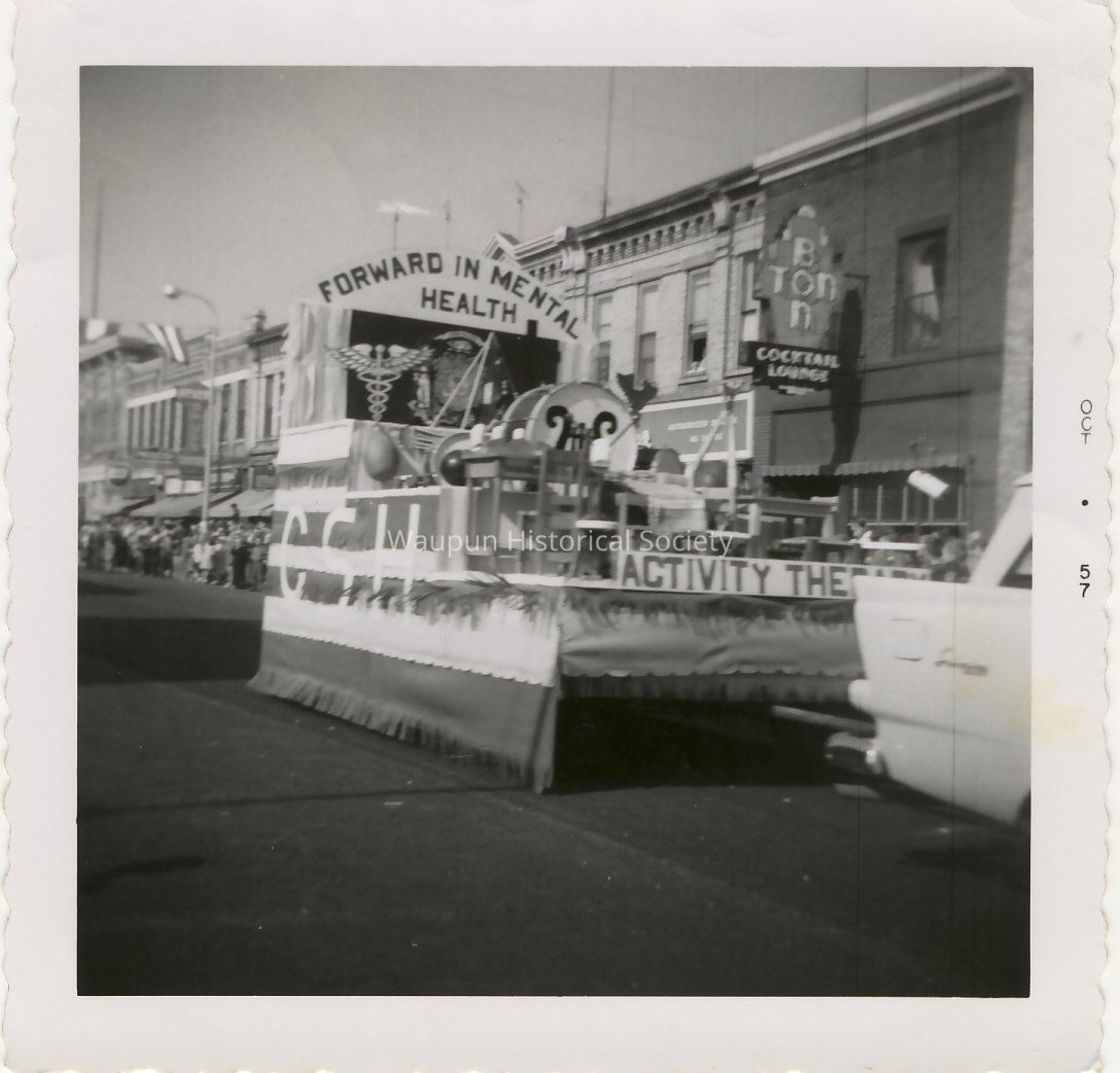 Photo of parade on Main Street Waupun. The event is not identified. The date of the side of the photo is October 1957. This photo was given to the Waupun Historical Society by the Fairwater Historical Society.Acquisition