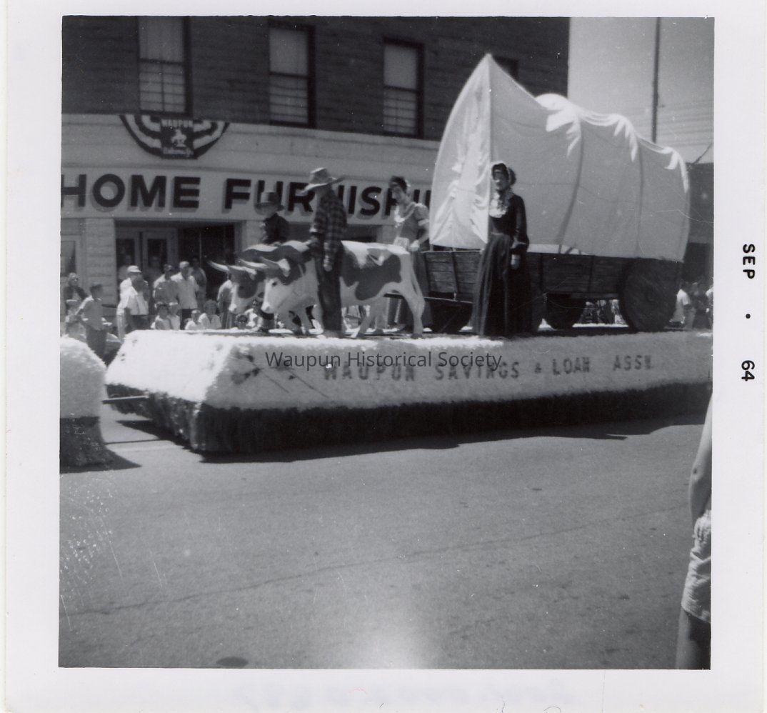 Parade 1964. This is an original photo taken at an unknown parade on main street in waupun in front of the Beau & Belle Home furnishing company. The Company was located at 111 E. Main Street and owned by Gerald J. Harmsen.