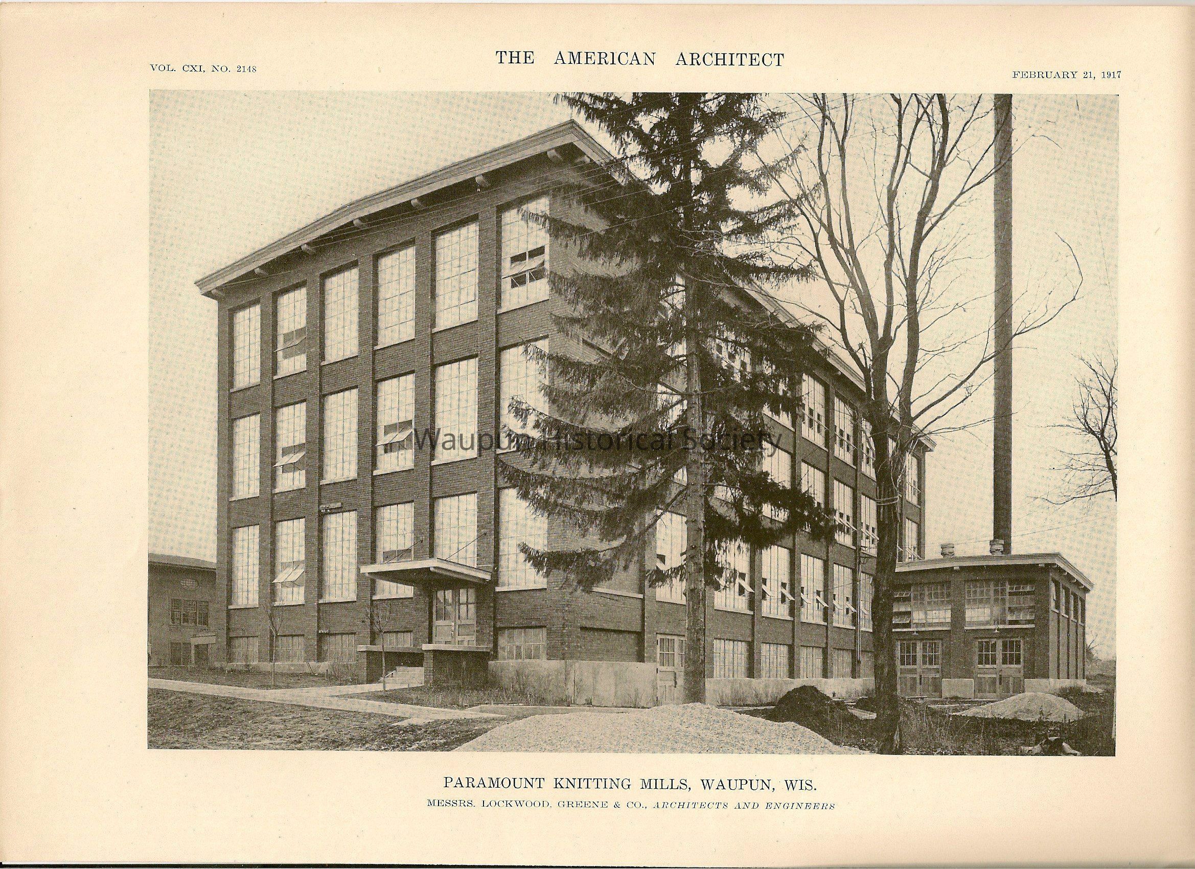 Photo of the Paramount Knitting Mills, Waupun, Wis. Under the name of the structure it indicates Messrs. Lockwood, Green and & Co., Architects and Engineers. The 1920 phone book lists these numbers and addresses: West Jefferson, S. Madison, and 15 W. Jefferson. It is believed that this building was at 15 W. Jefferson. There are several socks, pictures, and boxes from this firm in the museum holdings.Acquisition