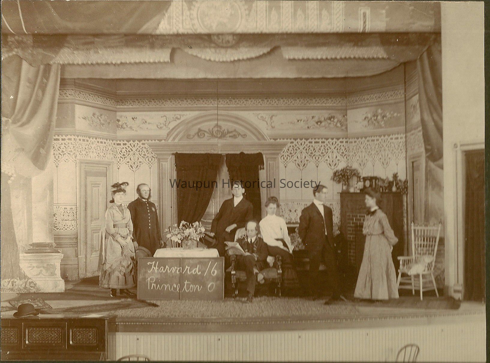 Photo of play. Unsure of the name of the play or the location. May be on the stage in the Fond du Lac Street school. Appears to the be the same play as in 2011.0005.0002. Both plays have the same furniture, fireplace and set.Acquisition