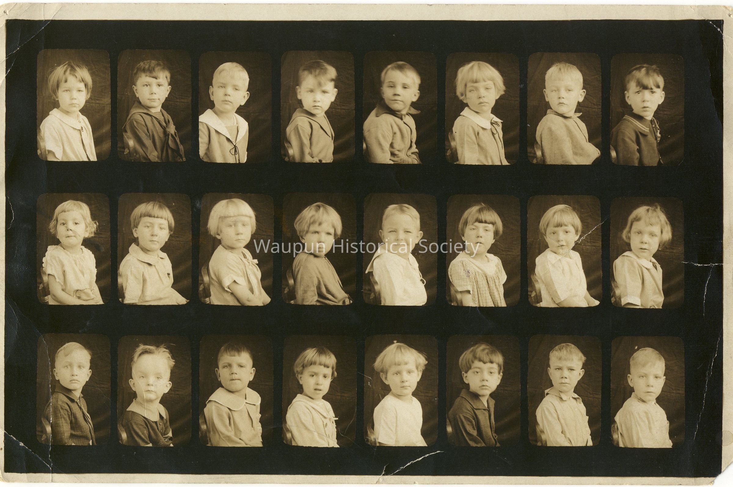 This photo is a set of individual photos, possibly used as a proof sheet. This picture is probably also Pearl Kerr's 1st grade class at South Ward School for the same year as 2001.0027.0002. However the year is unknown and most of the people in the photo remain unidentified.