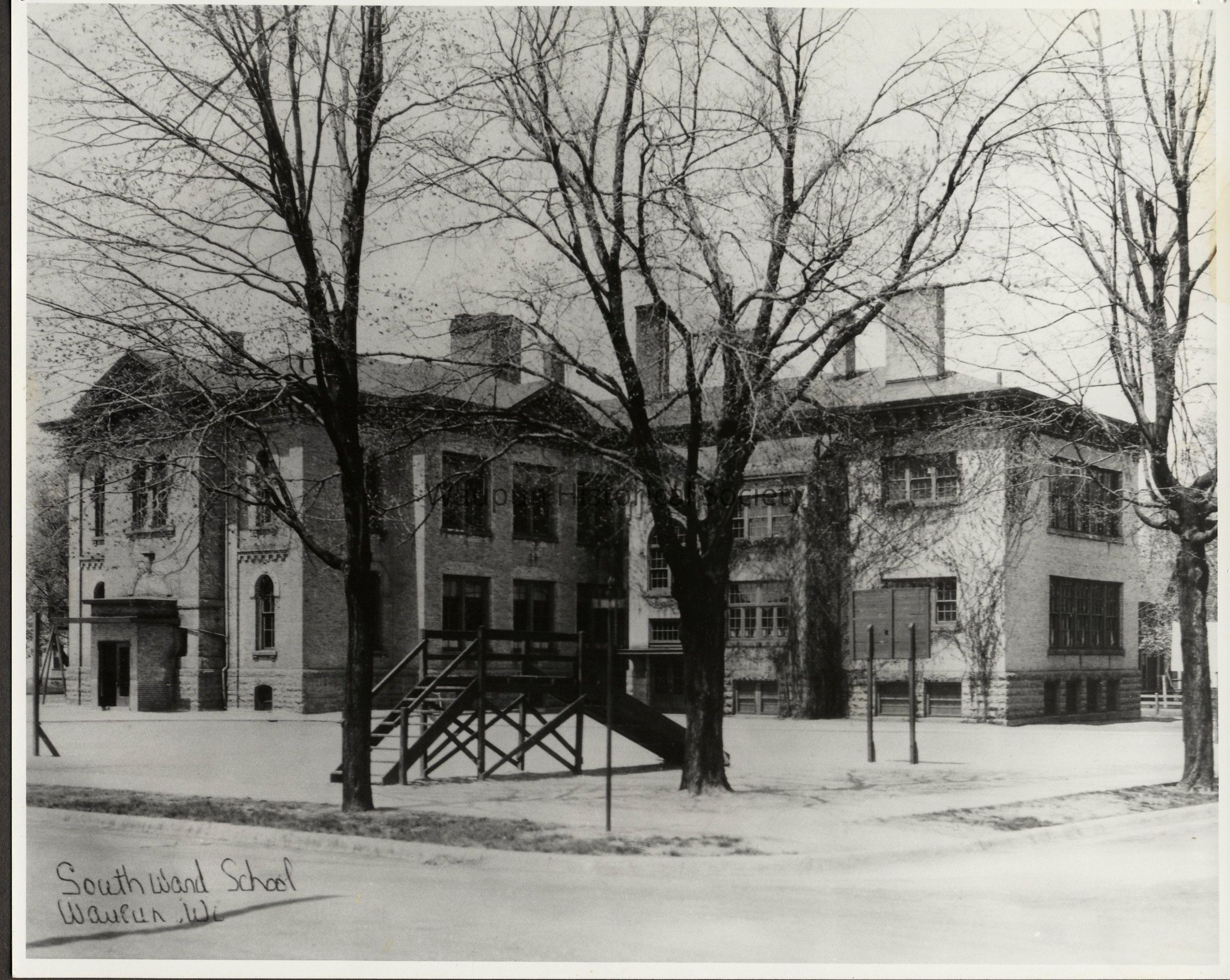 South Ward School. Photo from Mrs. John Russell (Flora Lou Amthor) of Menomenie, Wis. Dec. 1995. South Ward School erected 1872 located on E. Brown Street across from the Prison. (The present (2005) location of Waupun Public library)Acquisition