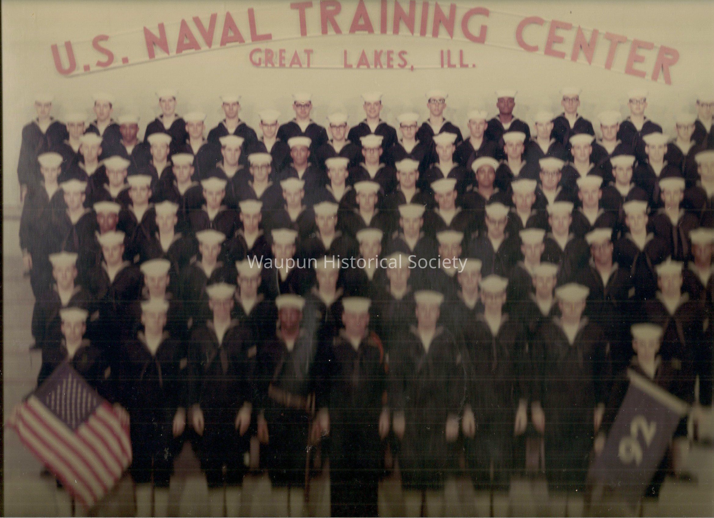 11 1/2" x 17" color photo on a cardboard backing from U.S. Naval Training Center in Great Lakes, Ill. Dave Gray, the brother of Sandra Gray who donated it, is in the 2nd row from back under the "L" of ILL.The flag held by sailor in the front row on the right indicates the units number. Uncertain of year this was taken.Acquisition
