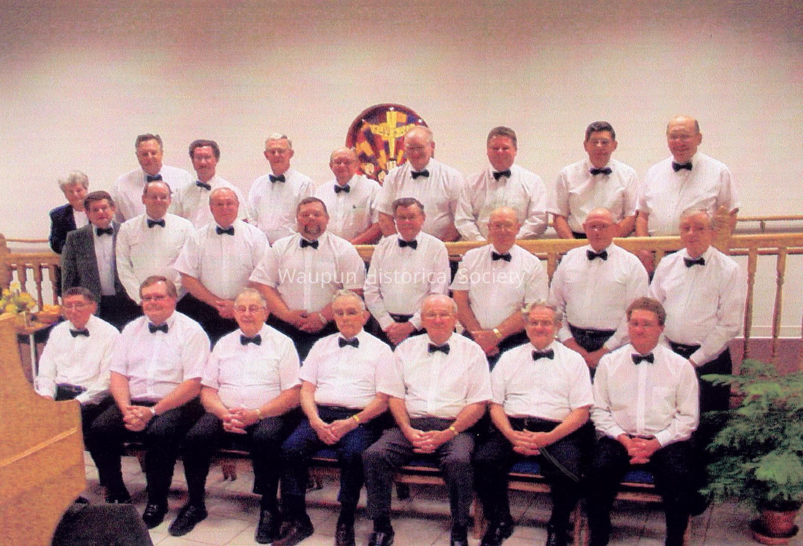 Photo of the "United Men of Praise." This is a group of men from different faiths that get together and sing. Left to right, Front (first) row: Loomans, Harley; Harmsen, Harland; Yunto, Garret; Lemmenes, Dave; Veleke, Lyle; Shore, Charles; Mulder, Wayne: Second (middle) row: Schaub, Harvey (Director); Lichtenberg, Garland; Ehlert, Art; Beekman, Ken; Buteyn, Don; Neevel, Wally; Vossekuil, Bernard; Miedema, Wayne: Third (back) row: Medema, Carol (accompanist); VandeZande, Ron; Walrort, Mark; Buteyn, Ron; TerBeest, Cal; Hopp, Elton; Oosterhouse, Robert; Dolgner, Ray; Siedschlag, John