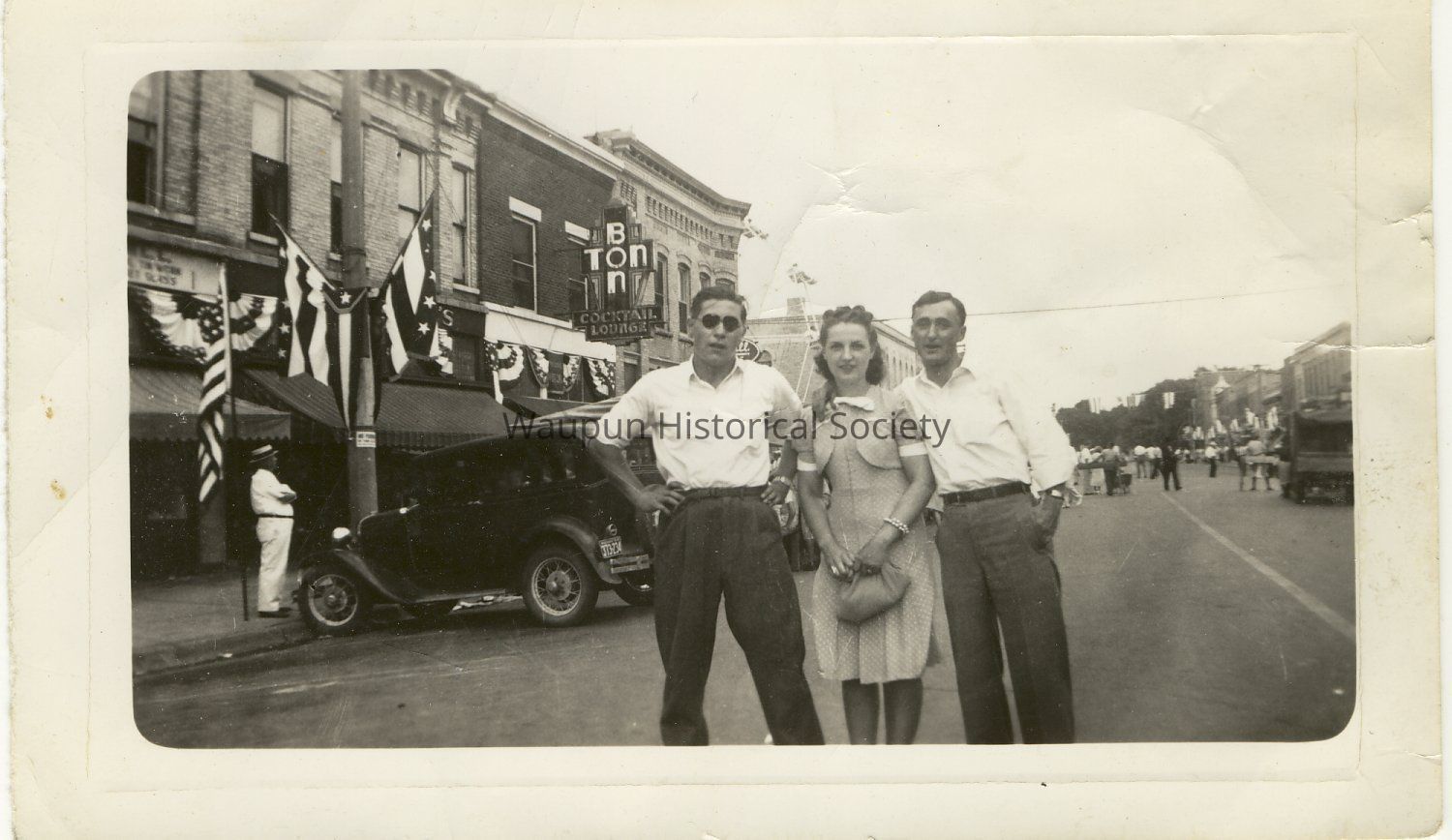 This photo is a photo of three unidentified people. The back of the photo is stamped July 11, 1939. If you note the many flags and other patriot decorations, it appears to have been taken while waiting for the 1939, July 4th parade.Acquisition