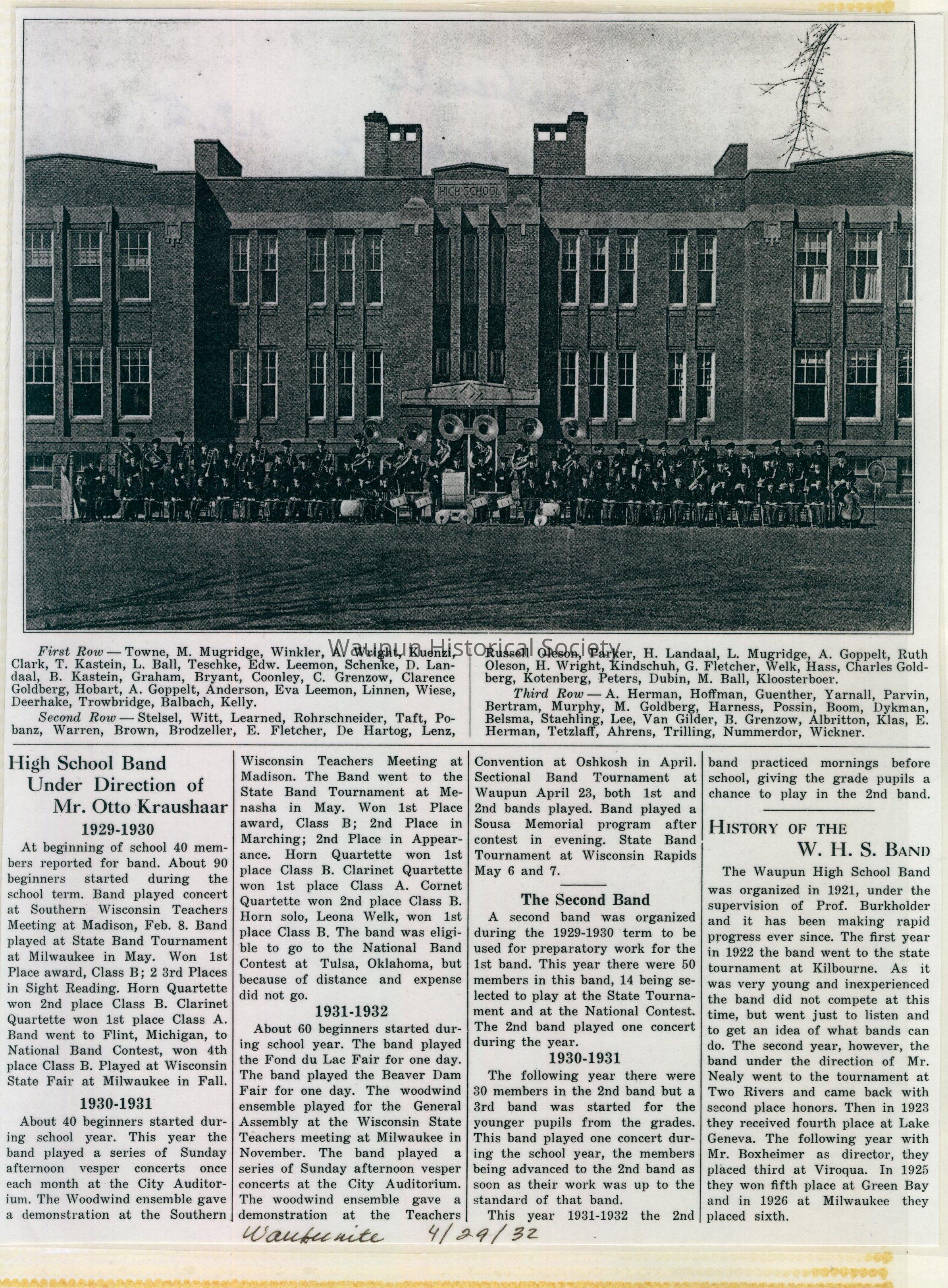Photo found in an unidentified box in the Waupun Heritage Museum work room. Please contact the Waupun Heritage Museum at 22 S. Madison St. Waupun, WI 53963. Phone No. 920-324-7931. This is a picture of the Waupun picture of the Waupun High School Band. We don't know exactly when it was taken and any names associated with the people in the picture. This picture was taken in front of the Waupun High School. Also on the back of the original photo, is written Historical Museum.