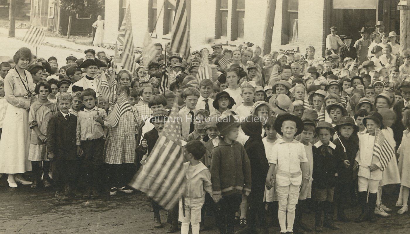 "Ready to Escort the boys to the Depot" This postcard shows the communities procession taking men to the Depot and then off to WWI. Dated Sept. 18, 1917.Acquisition