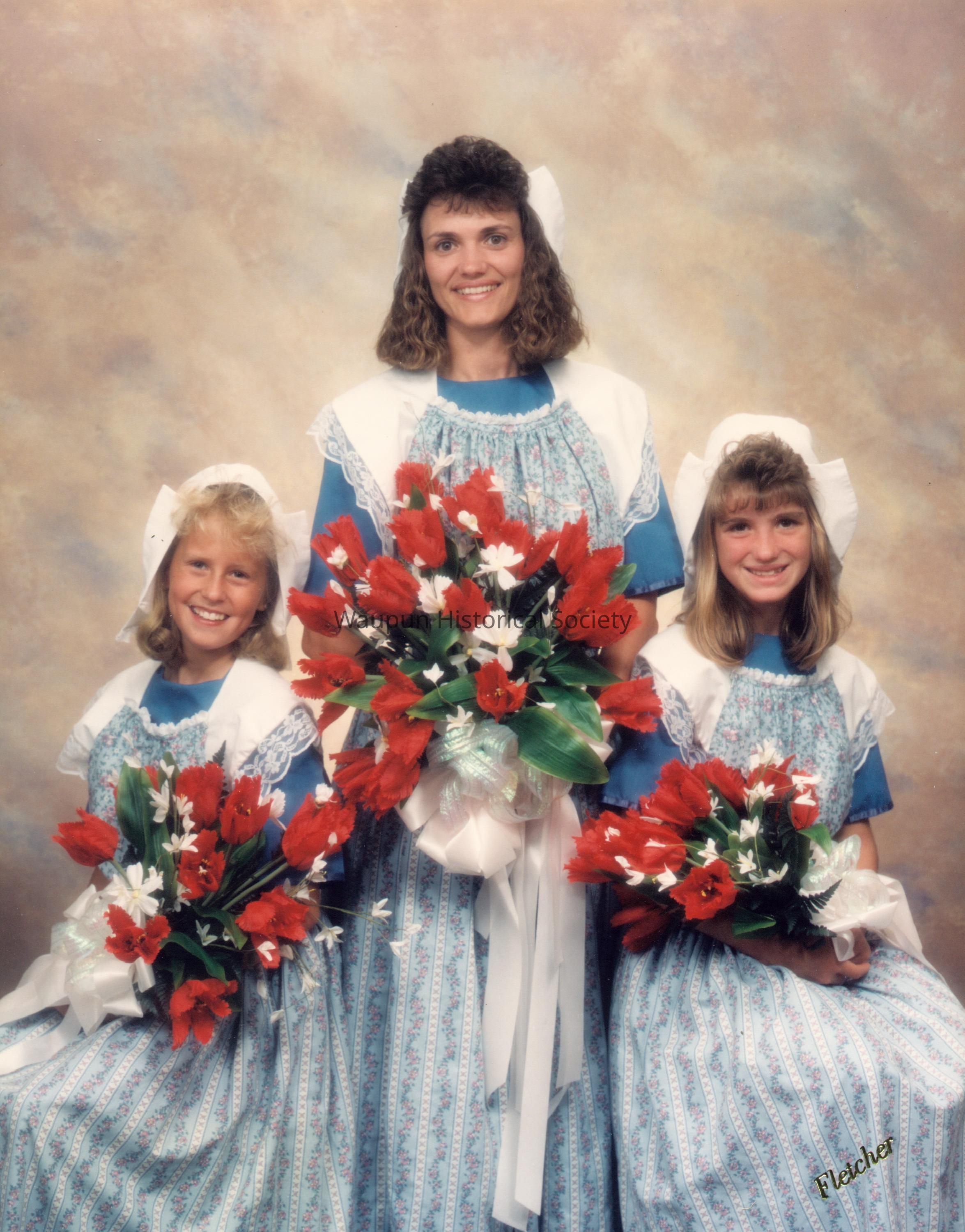 Picture of the 1994 Klompenfest Queen, Brenda Huizenga, and Princesses Heather Herringa and Tricia Huizenga. Klompenfest was a local festival that operated from 1992 to 1998. In 1998 the committee disbanded and converted their funds to build the Wind Mill on Brandon Street.Acquisition