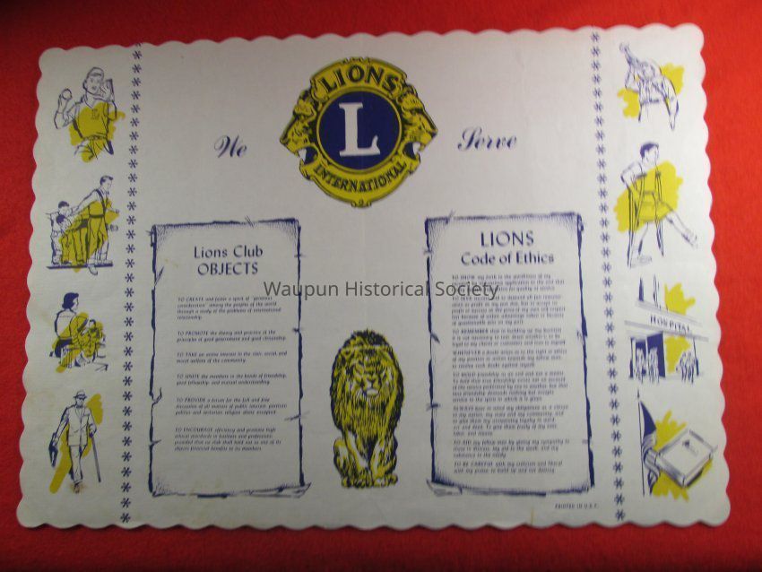 Lions Club placemat, Ivory with blue and yellow print with the Lions International insignia and the words "We Serve". Pictures at the right and left sides show whom they serve; a drawing of a lion is between The Lions Club Objects and Code of Ethics are also printed on the mat.