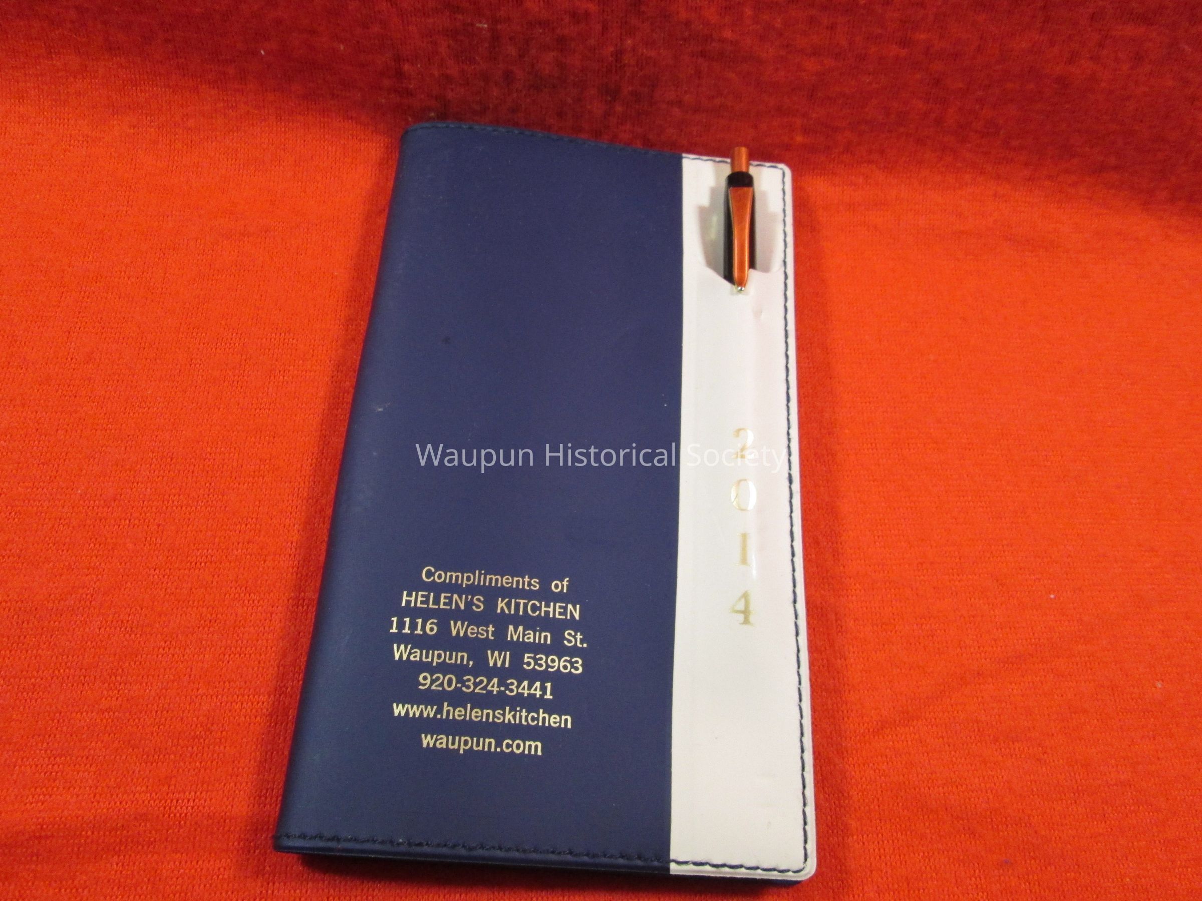 1- Pocket Pal (Diary) A day to day accounted of what happening in your life and appointment and business dates blue in color and compliments of HELEN'S Kicthen 1116 west Main street in Waupun Wis. With a pen. The year 2014 is in gold lettering.Acquisition