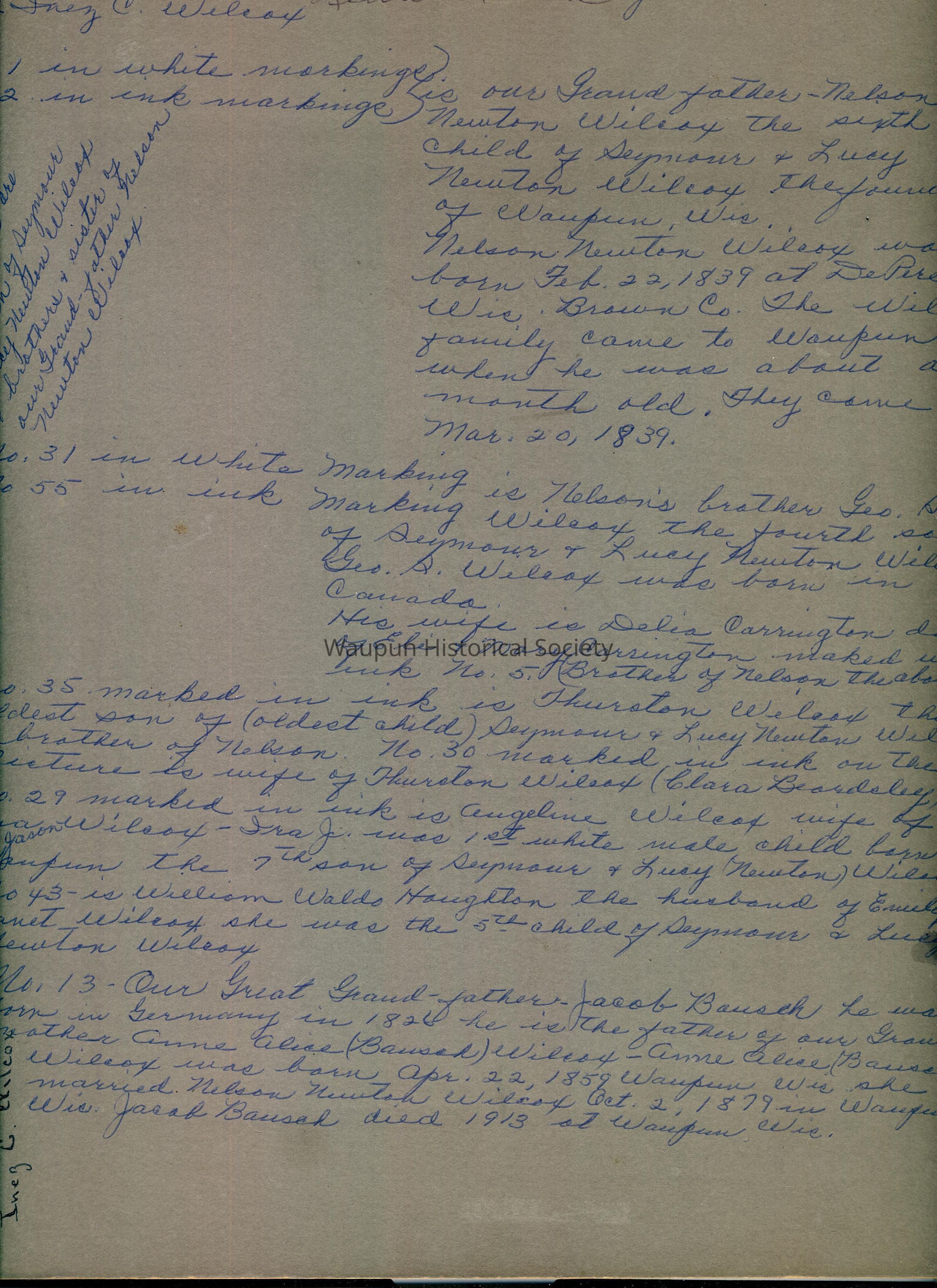 No. 31 in white markings and No. 55 in ink markings is Nelson's brother Geo. S. Wilcox, the 4th son of Seymour and Lucy Newton Wilcox. Geo. S. Wilcox was born in Canada. His wife is Delia Carrington, daughter of Eli and Mary Carrington marked with ink No. 5 (brother of Nelson, the above Geo.)