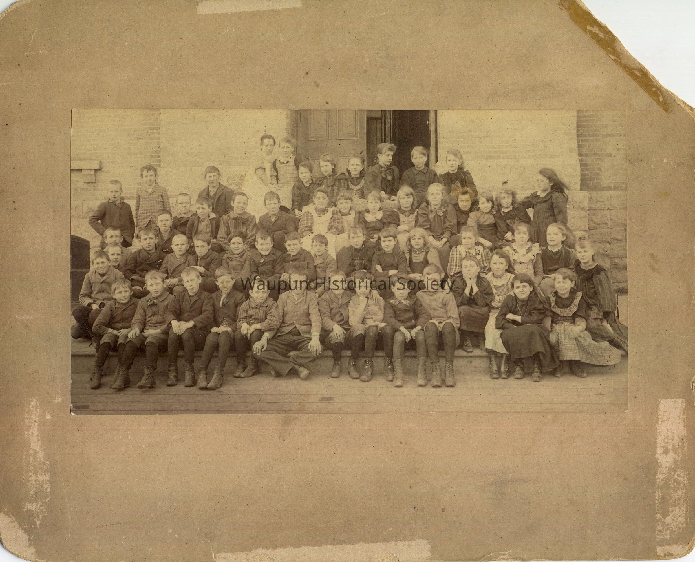 Photo found in an unidentified box in the Waupun Heritage Museum work room. Please contact the Waupun Heritage Museum at 22 S. Madison St. Waupun, WI 53963. Phone No. 920-324-7931. This is a picture of the class of the South Ward School about 1895. This is written on the back of photo. Also is written that it is the front entrance to the old South Ward Grade and High School. There is other names on the back of Jessie Fieldstad Oleson to Edith Scott.Acquisition