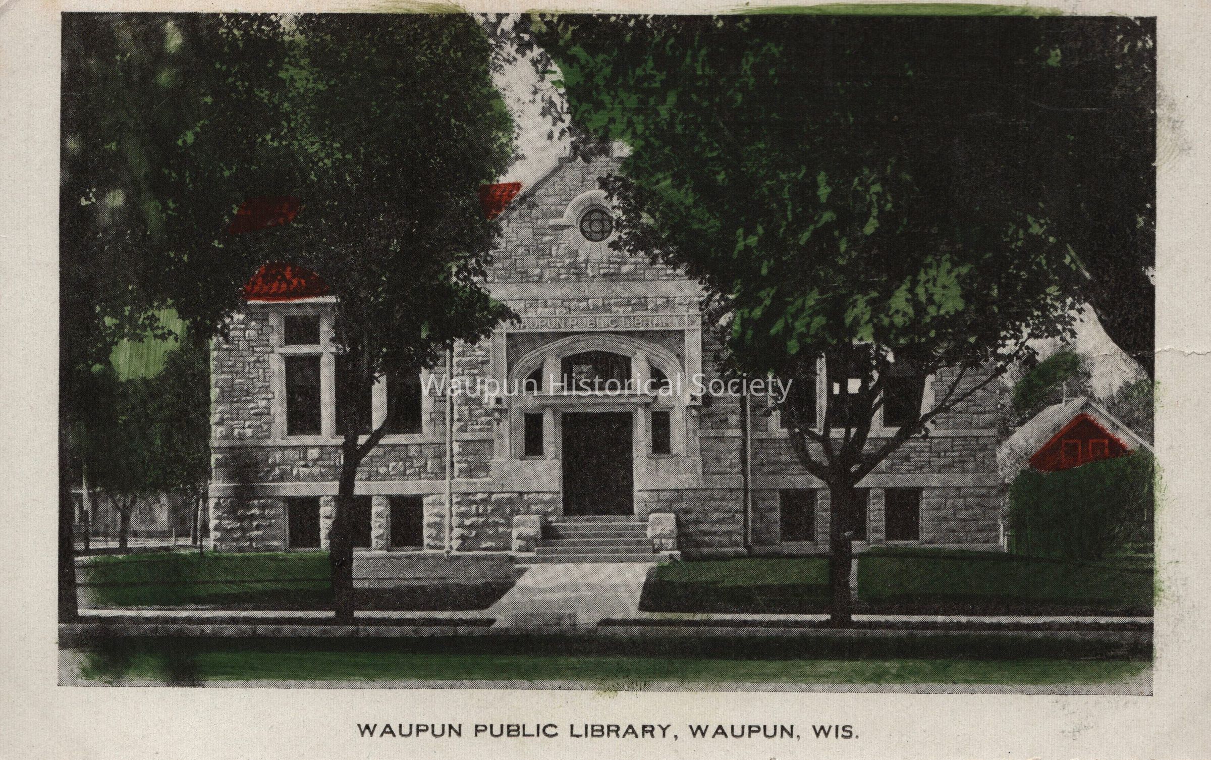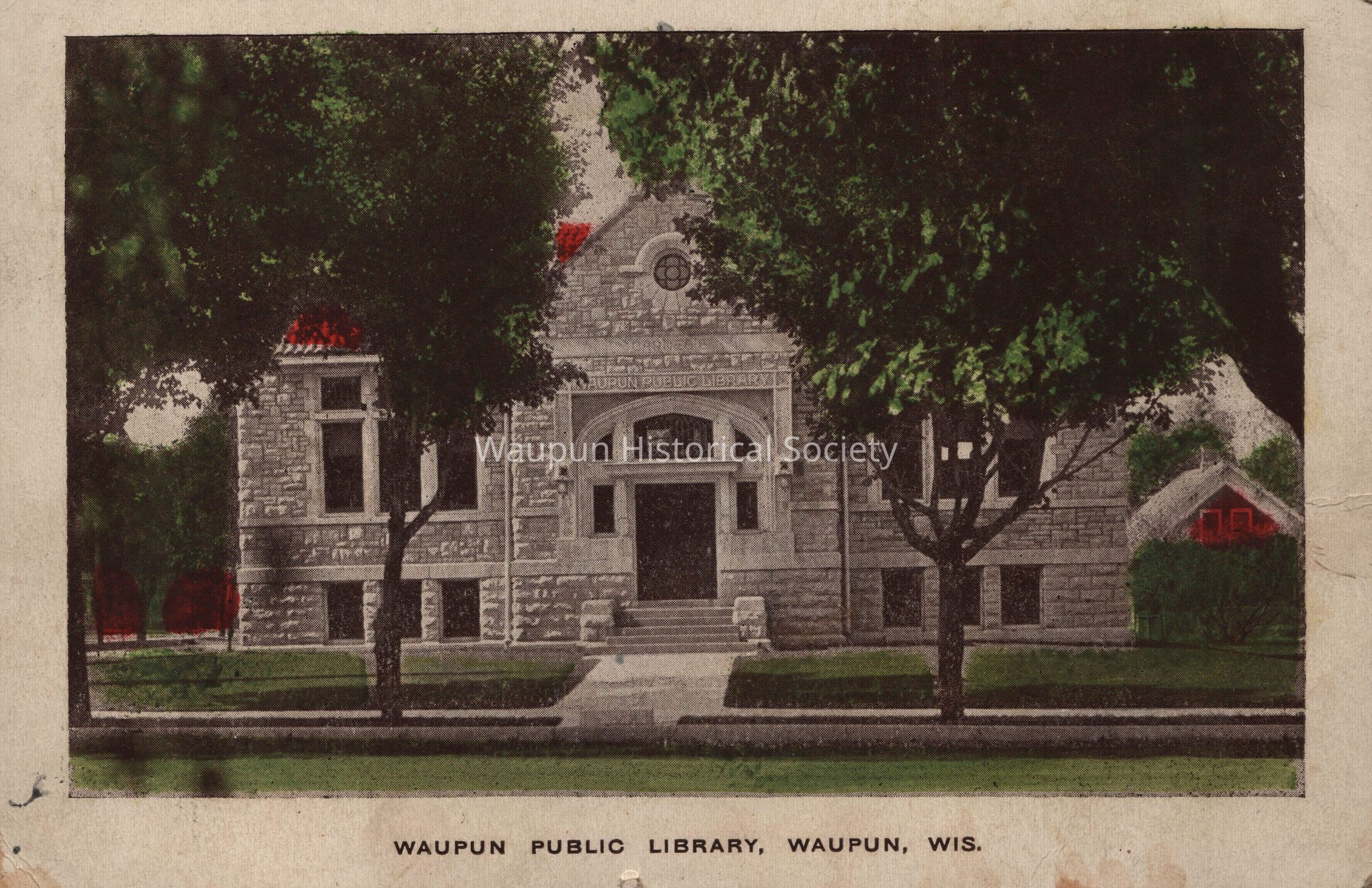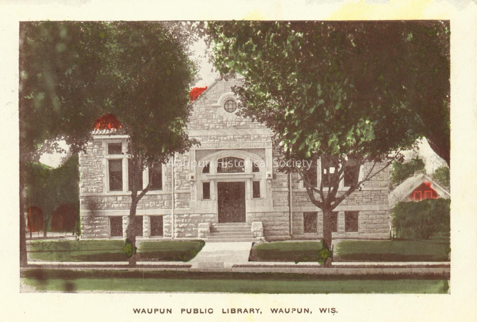 Postcard, Library, Museum. Postcard of the "Waupun Public Library." This is a Carnegie building. Andrew Carnegie (1835 - 1919) gave the money to build the building. The cornerstone is dated 1904.Acquisition