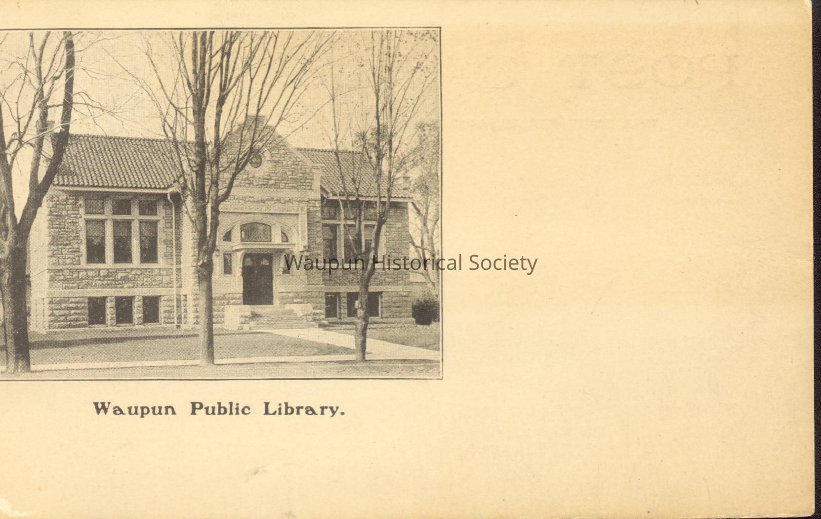 Postcard, Library, Museum. Postcard of the "Waupun Public Library." This is a Carnegie building. Andrew Carnegie (1835 - 1919) gave the money to build the building. The cornerstone is dated 1904.Acquisition