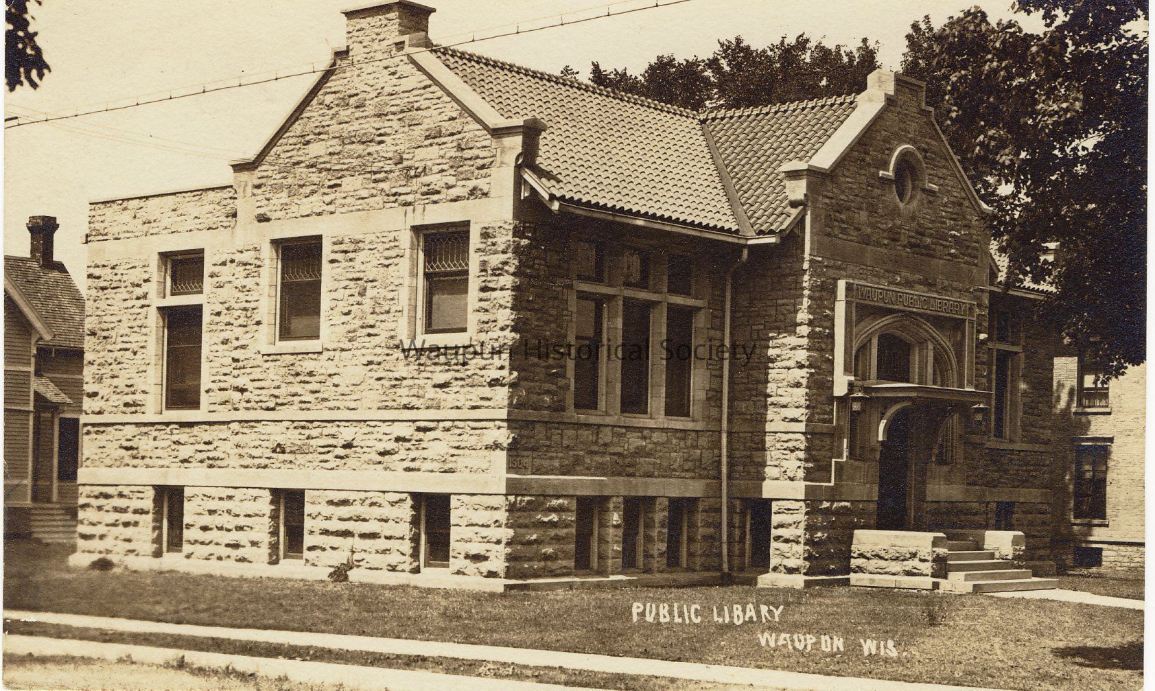 Photograph, Library, Museum. Photo of the "Waupun Public Library." This is a Carnegie building. Andrew Carnegie (1835 - 1919) gave the money to build the building. The cornerstone is dated 1904. Picture was taken for the Waupun Historical Society Stationery, probably in 2000 or 2001,Acquisition