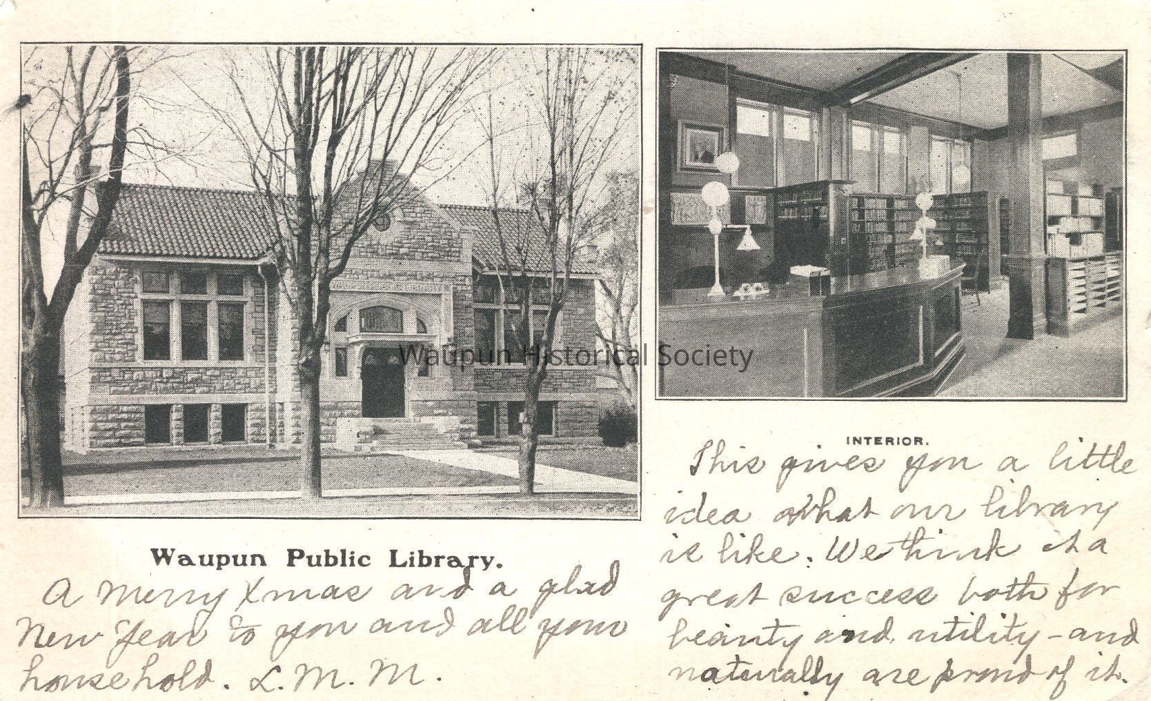 Postcard, Library, Museum. Postcard of the "Waupun Public Library." This is a Carnegie building. Andrew Carnegie (1835 - 1919) gave the money to build the building. The cornerstone is dated 1904. This card is postmarked Dec. 23, 1905Acquisition