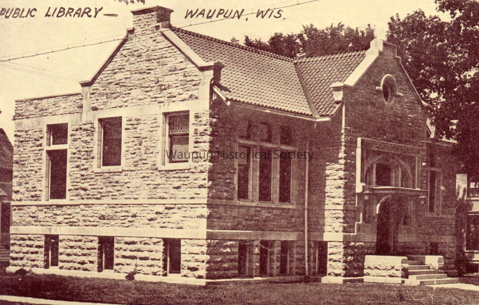 Postcard, Library, Museum. Postcard of the "Waupun Public Library." This is a Carnegie building. Andrew Carnegie (1835 - 1919) gave the money to build the building. The cornerstone is dated 1904.Acquisition