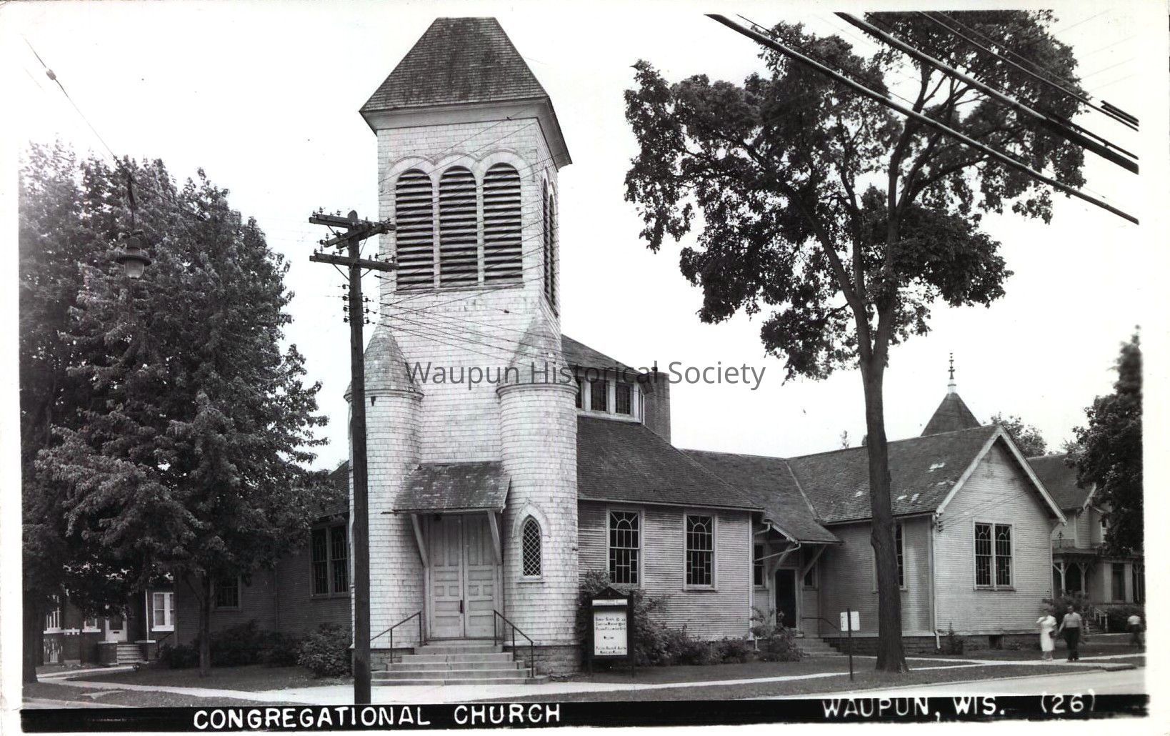 Postcard, Church, Congregational. Waupun Churches. This Black & White picture postcard shows the Congregational Church of Waupun, Wis. It was donated by Jim Laird from his personal collection. This is an unused postcard.