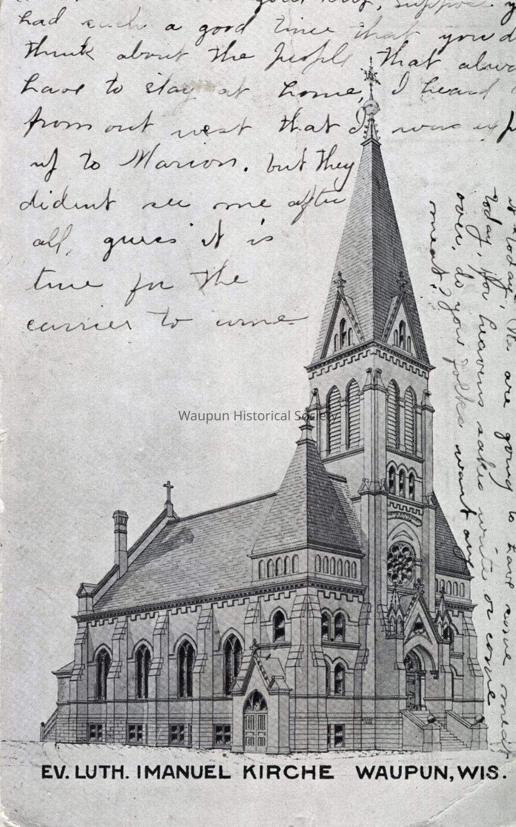 Postcard, Church, Ev. Lutheran Imanuel Kirche. Waupun Churches. This picture postcard is of an early drawing of the Evangelical Lutheran Immanuel Church. It was donated by Jim Laird from his personal collection. It is postmarked 1911. Note that the printing on the card is in German.Acquisition