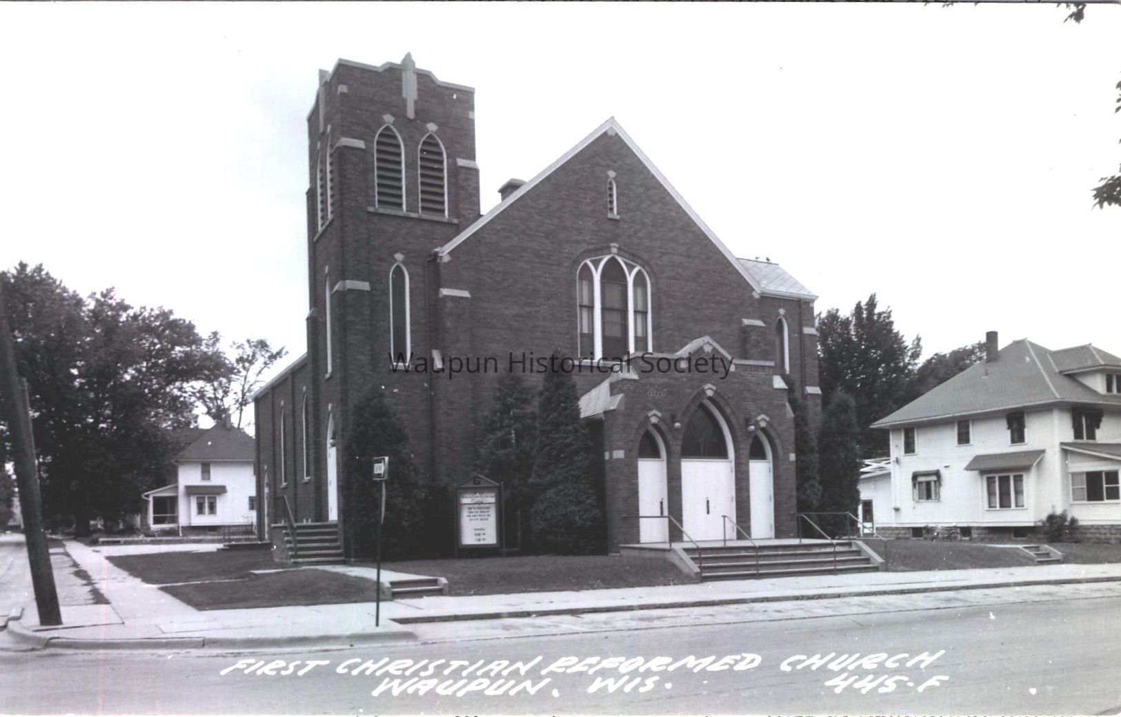 Waupun Churches. This Black & White picture postcard shows the First Christian Reformed Church of Waupun, Wis. It was donated by Jim Laird from his personal collection. This is an unused postcard.Acquisition