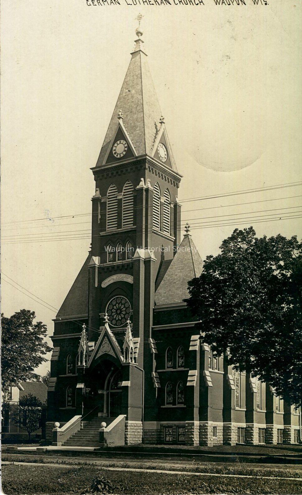 Postcard, Church, German Lutheran. Waupun Churches. This black & White picture postcard shows the German Lutheran Church of Waupun, Wis. It was donated by Jim Laird from his personal collection. The postmark is not legible.Acquisition