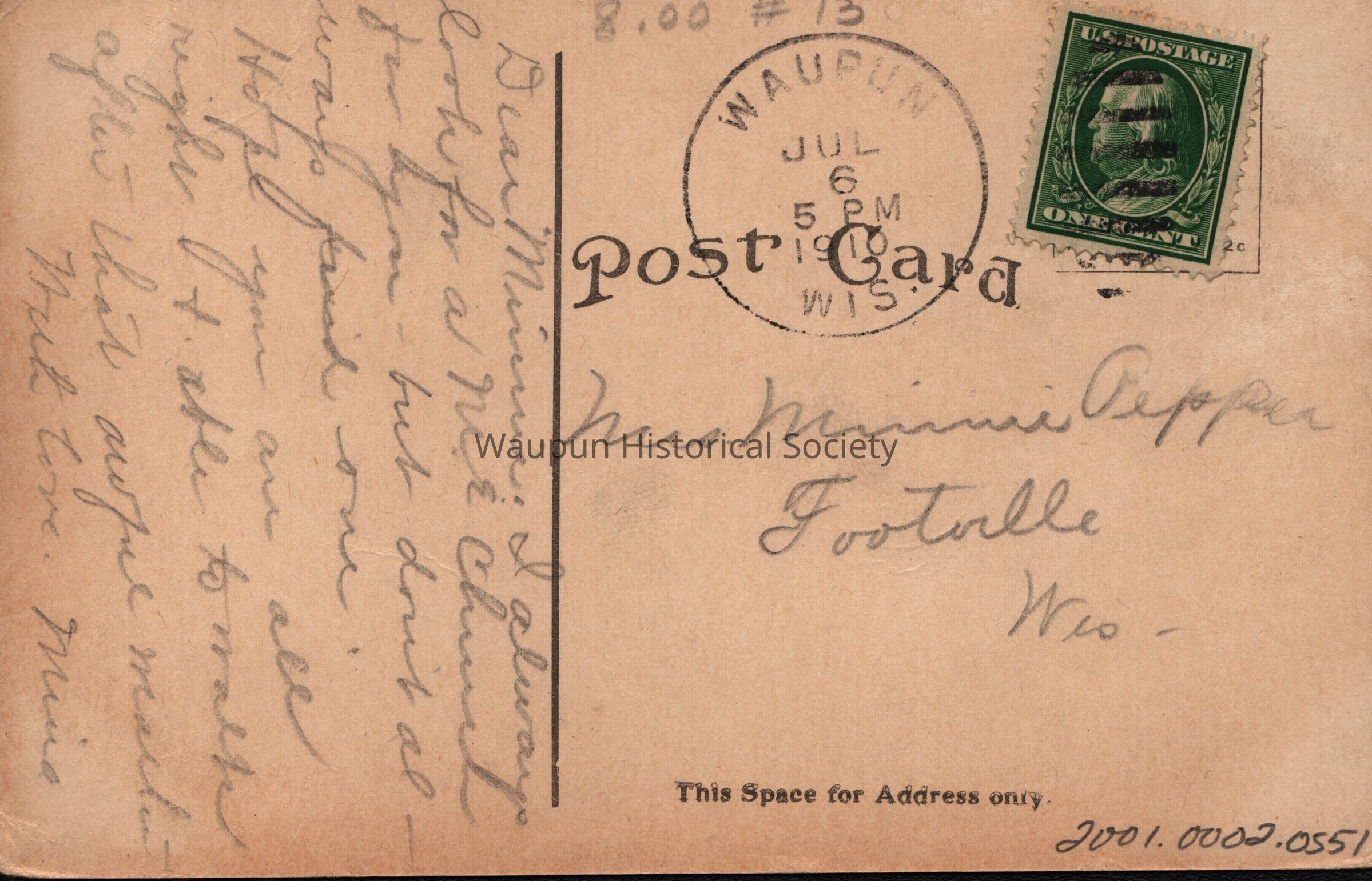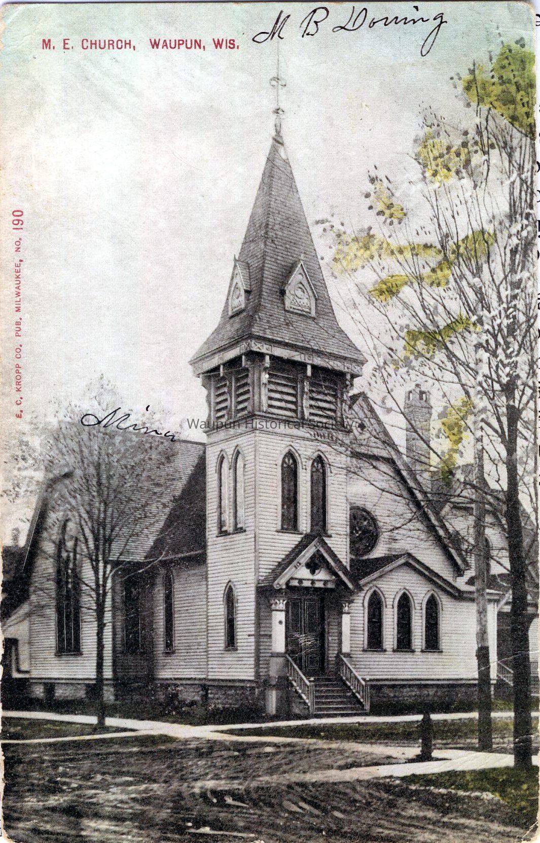 Postcard, Church, Methodist. Waupun Churches. This picture postcard shows the Methodist Church of Waupun, Wis. It was donated by Jim Laird from his personal collection. This postcard is postmarked July 6, 1910.Acquisition