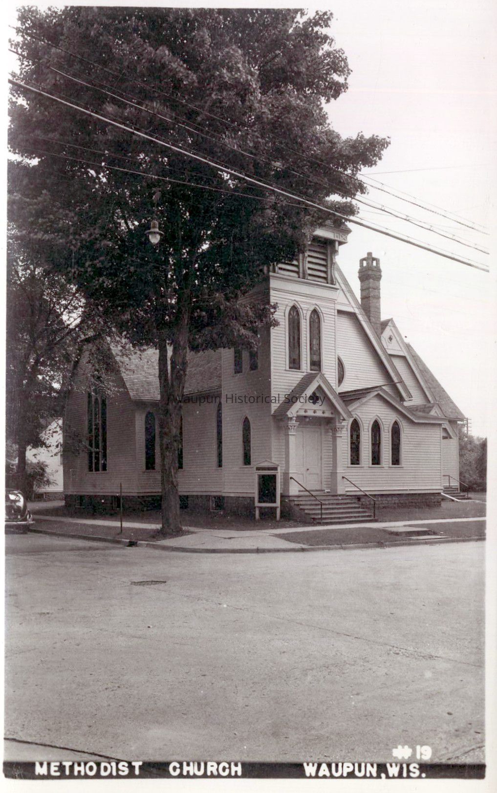 Postcard, Church, Methodist, #19. Waupun Churches. This Blakc & White picture postcard shows the Methodist Church of Waupun, Wis. It was donated by Jim Laird from his personal collection. This is an unused postcard.Acquisition