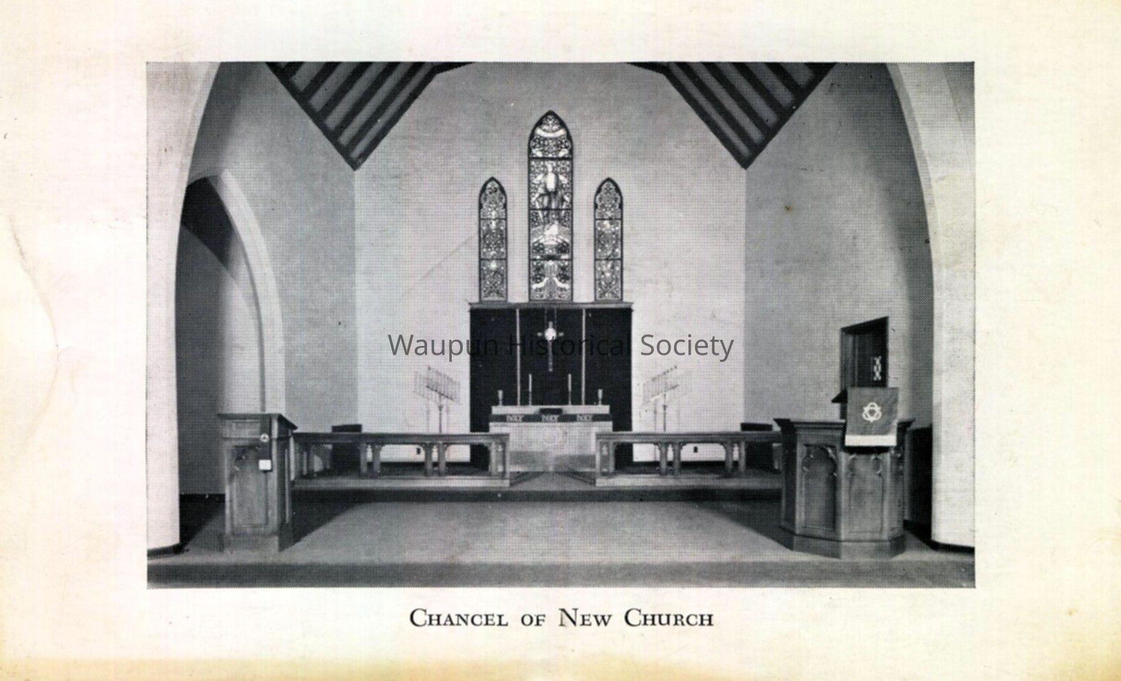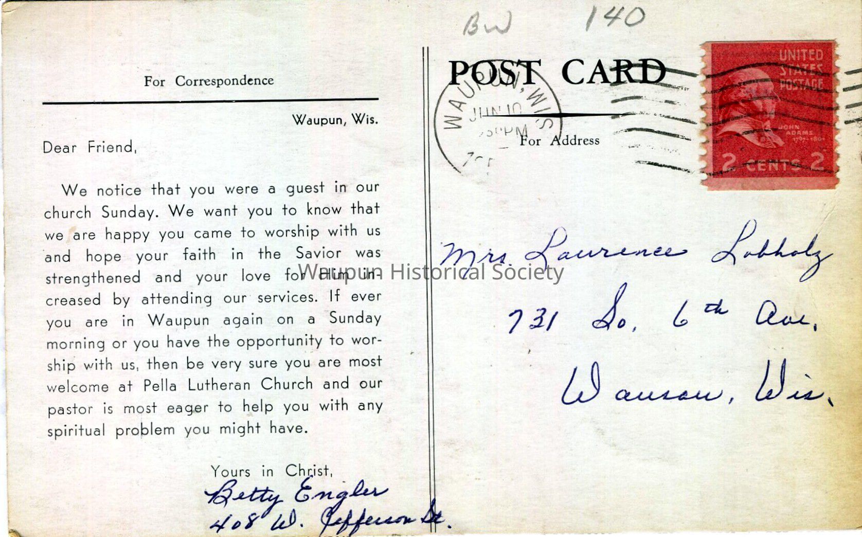 Postcard, Church, Pella Lutheran. Waupun Churches. This Black & White picture postcard shows the Pella Lutheran Church of Waupun, Wis. It was donated by Jim Laird from his personal collection. This postcard was used as a welcoming card after a person(s) visited the church for the first time. A brief letter is printed on the back. It is postmarked for June 10, 195_.Acquisition