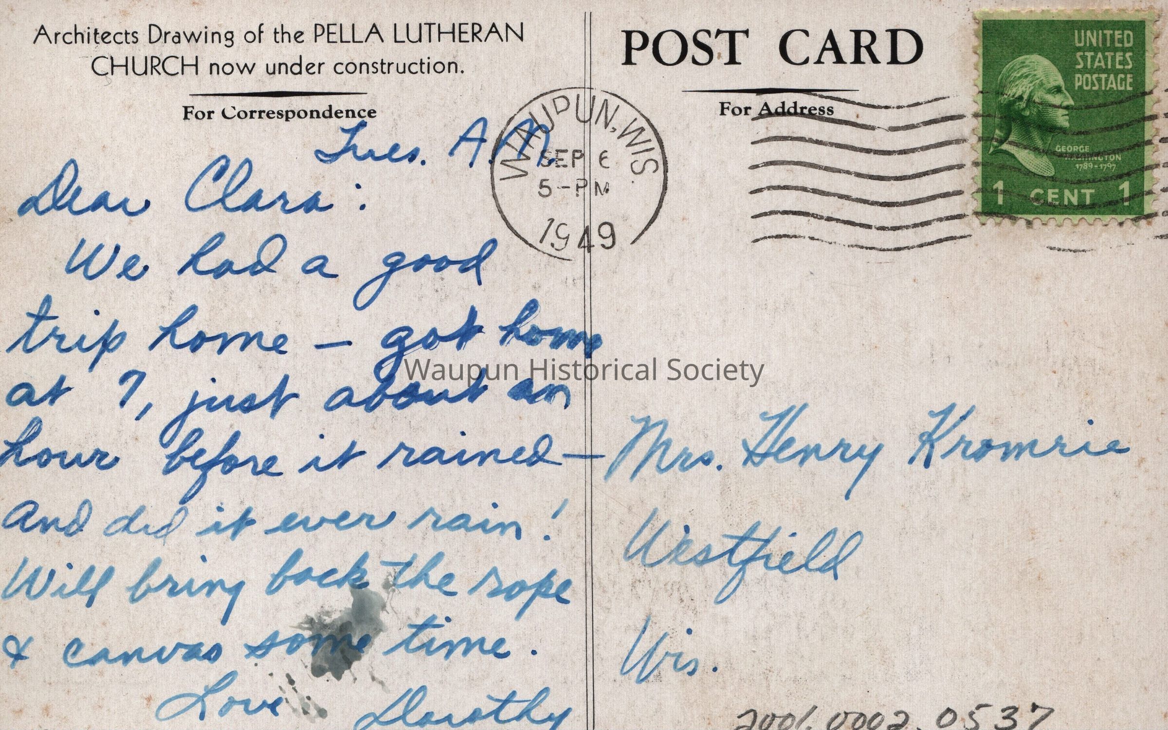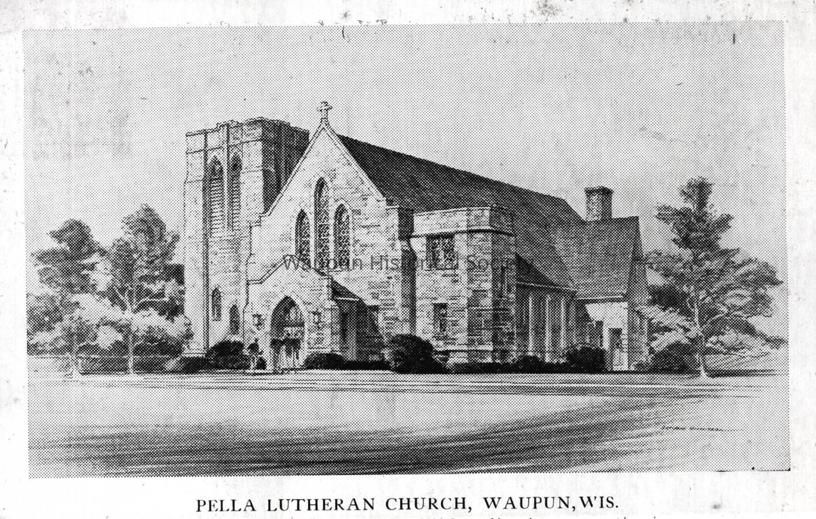 Postcard, Church, Pella Lutheran. Waupun Churches. This black & white picture postcard comes from Jim Laird's personal collection. Architects drawing of the Pella Lutheran Church, which may have been under construction in 1949. Postmarked Sept. 6, 1949Acquisition