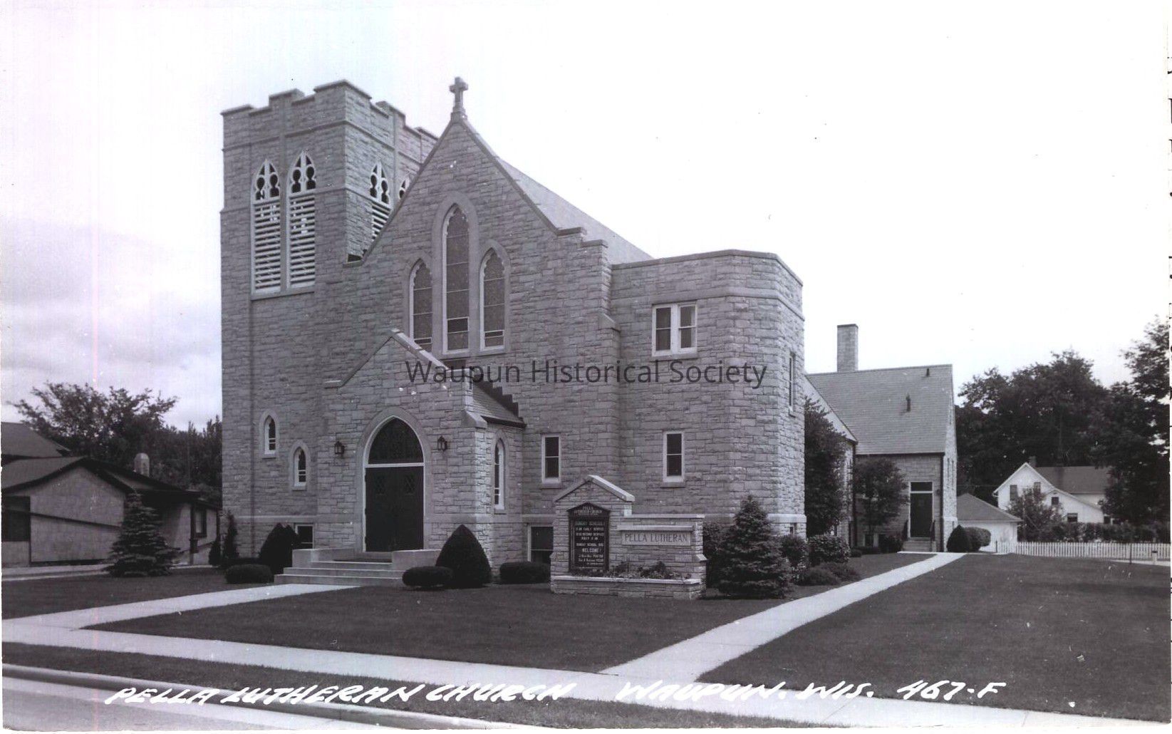 Postcard, Church, Pella Lutheran, #467-F. Waupun Churches. This Black & White picture postcard shows the Pella Lutheran Church of Waupun, Wis. It was donated by Jim Laird from his personal collection. It is an unused postcard.Acquisition