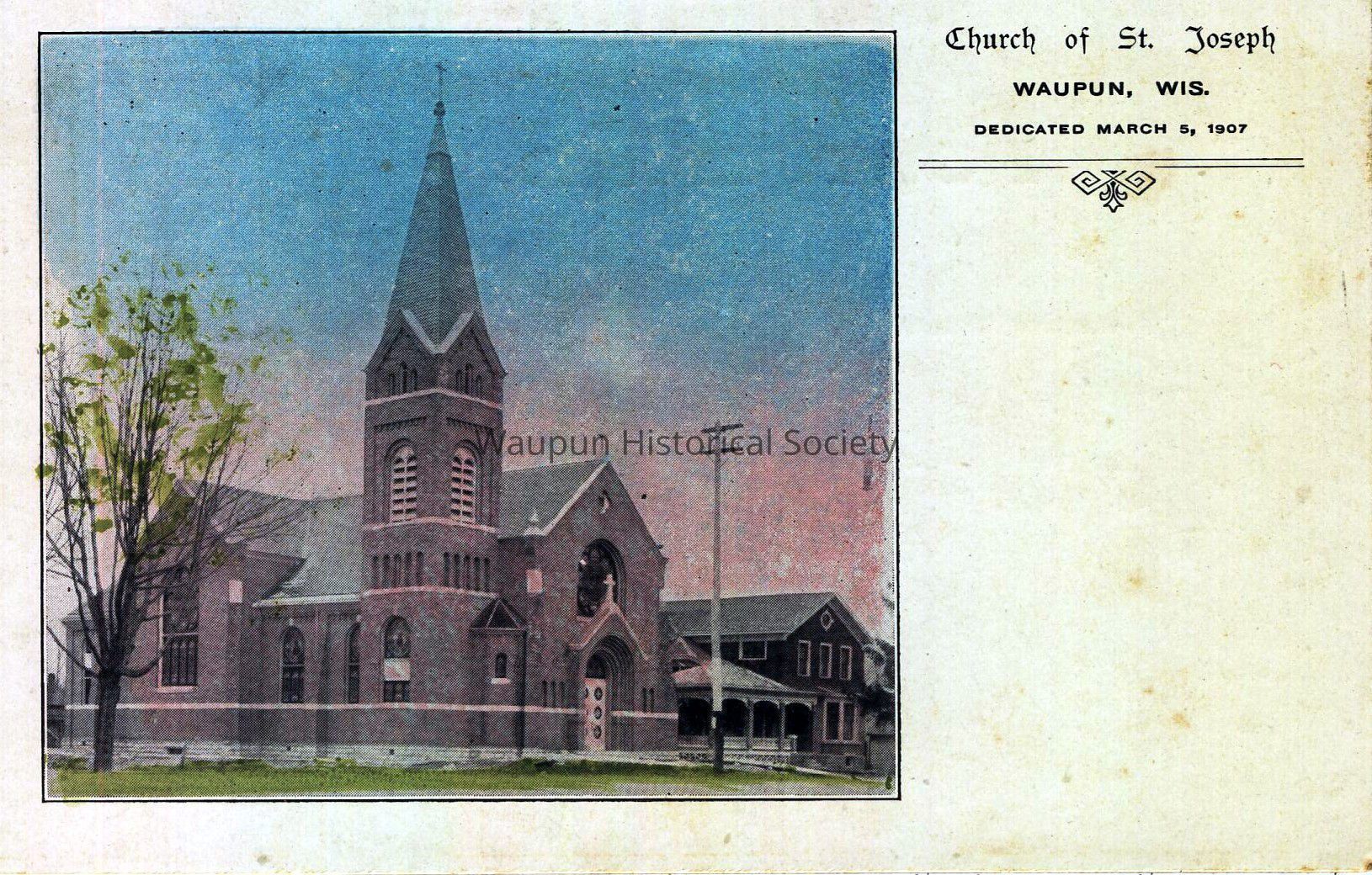 Postcard, Church, St. Joseph Catholic, Dedicated March 1907. Waupun Churches. This colorized picture postcard shows the St. Joseph's Catholic Church of Waupun, Wis. It was donated by Jim Laird from his personal collection. This is an unused postcard. Printed on the upper right hand of the front of the card it says: "Church of St. Joseph, Waupun, Wis. Dedicated March 5, 1907.Acquisition